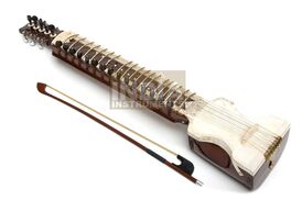 The dilruba is very similar to the esraj in design and the manner in which it is played. However, it has a somewhat bigger, square resonating corpus, is generally built a little bigger and has 20 instead of 15 sympathetic strings. Its sound is therefore clearly more powerful than that of an esraj.