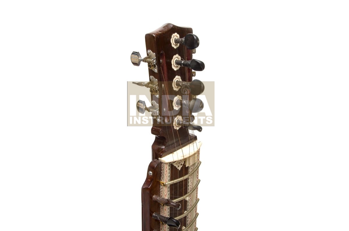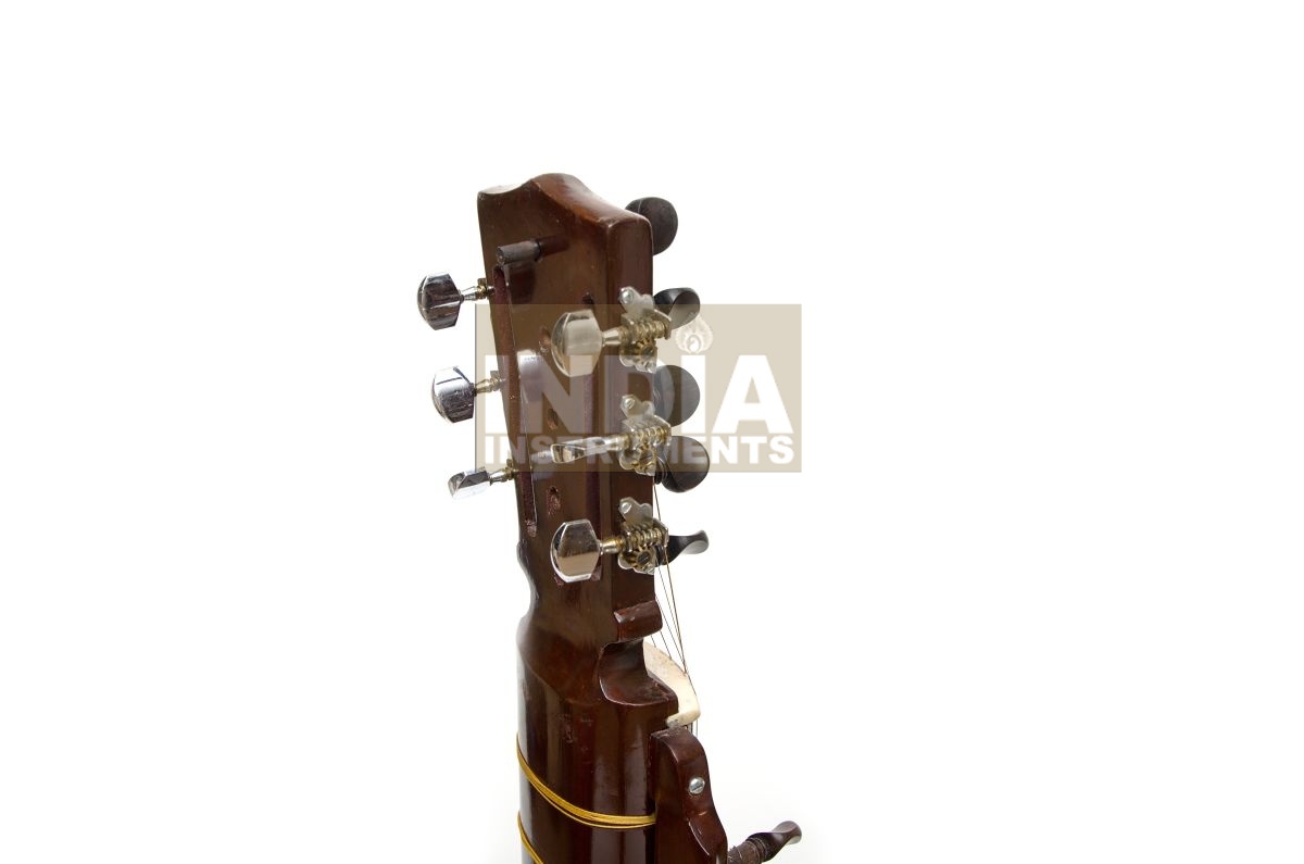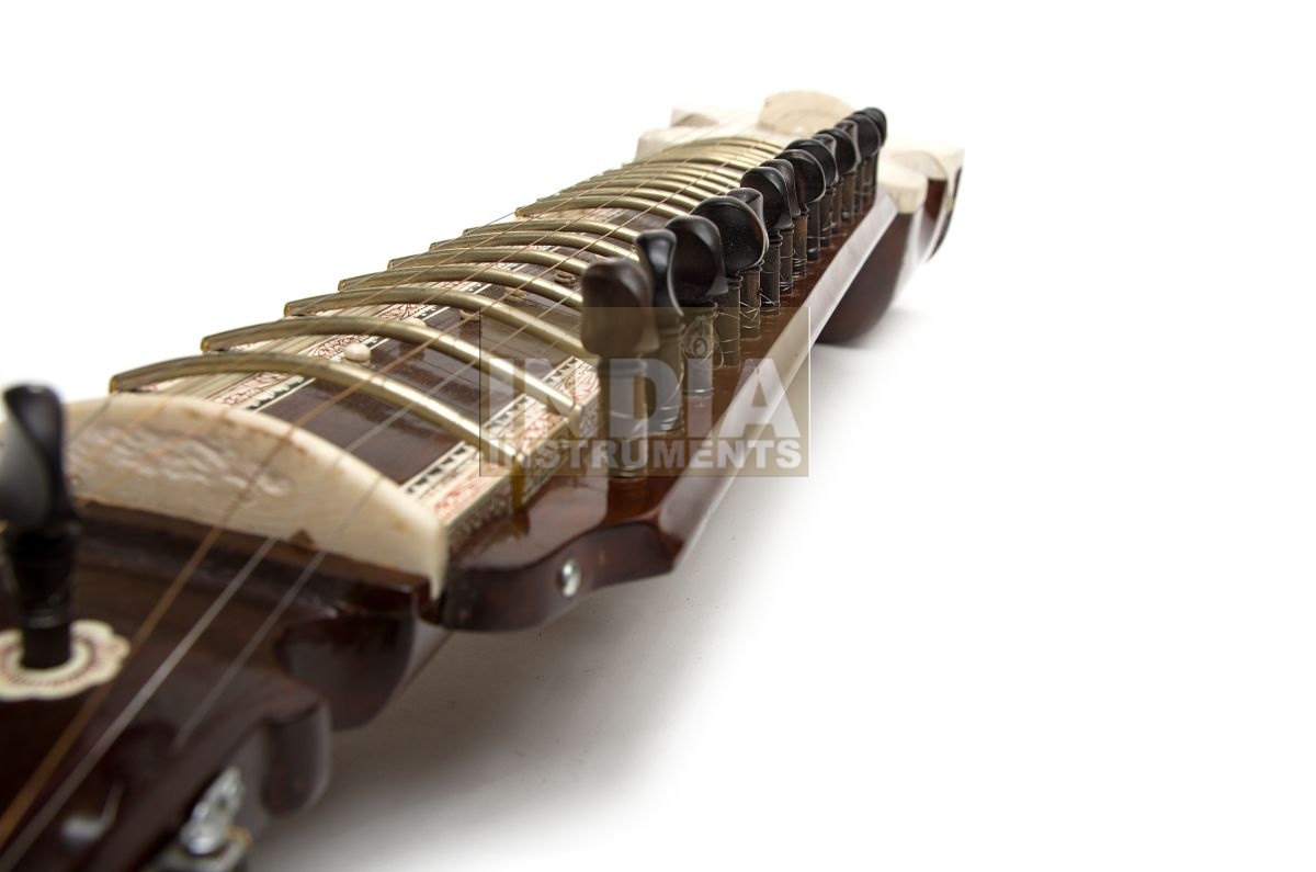 The Dilruba Hybrid by Monoj Kumar Sardar offers a high quality of materials and workmanship and a full, powerful, round sound. The wooden pegs for all sympathetic strings preserve the traditional character of the instrument and keep the weight low. The cogwheel tuning mechanisms for the 6 main strings allow for very accurate tuning quite easily.