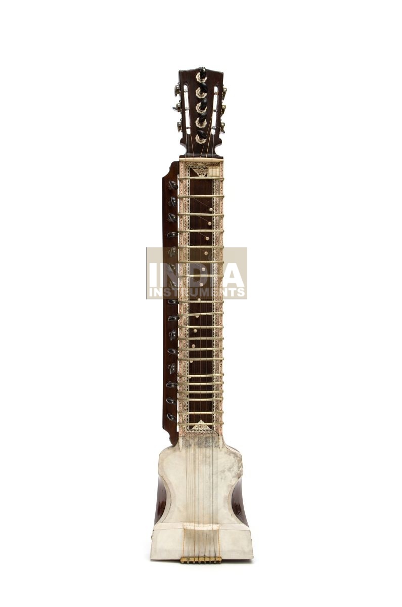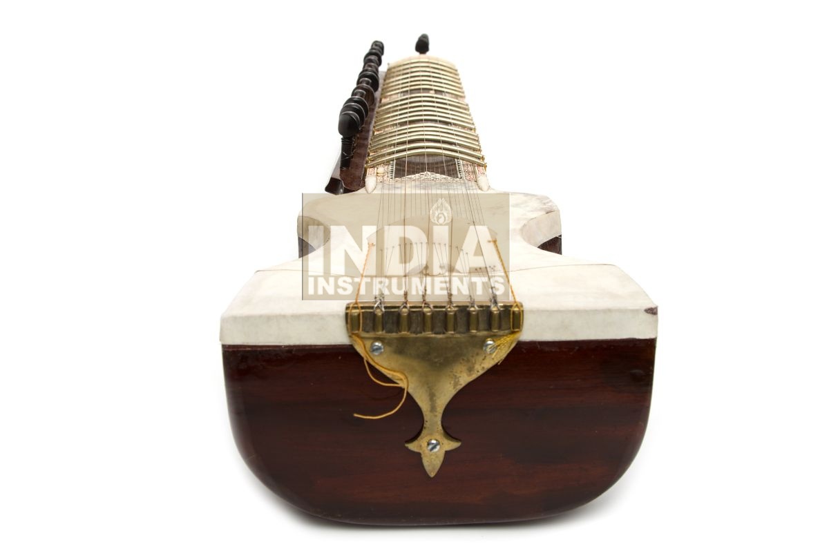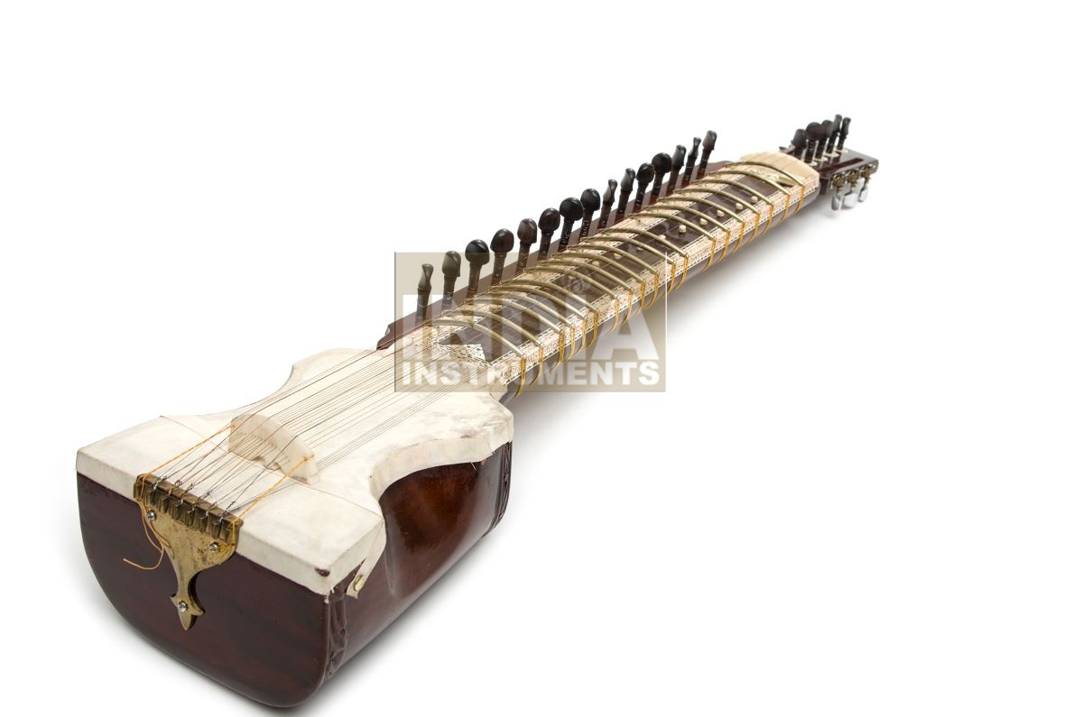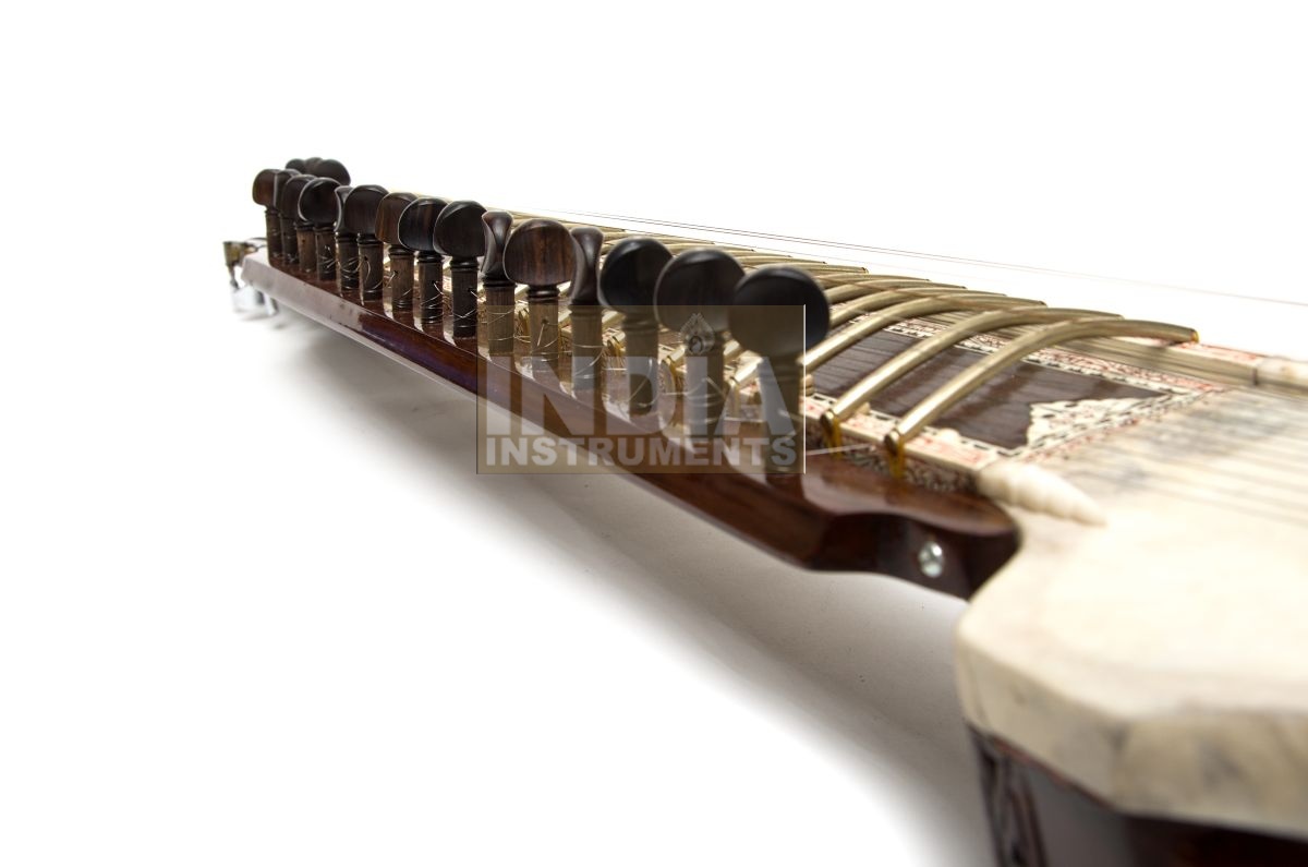 The Dilruba Hybrid by Monoj Kumar Sardar offers a high quality of materials and workmanship and a full, powerful, round sound. The wooden pegs for all sympathetic strings preserve the traditional character of the instrument and keep the weight low. The cogwheel tuning mechanisms for the 6 main strings allow for very accurate tuning quite easily.