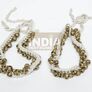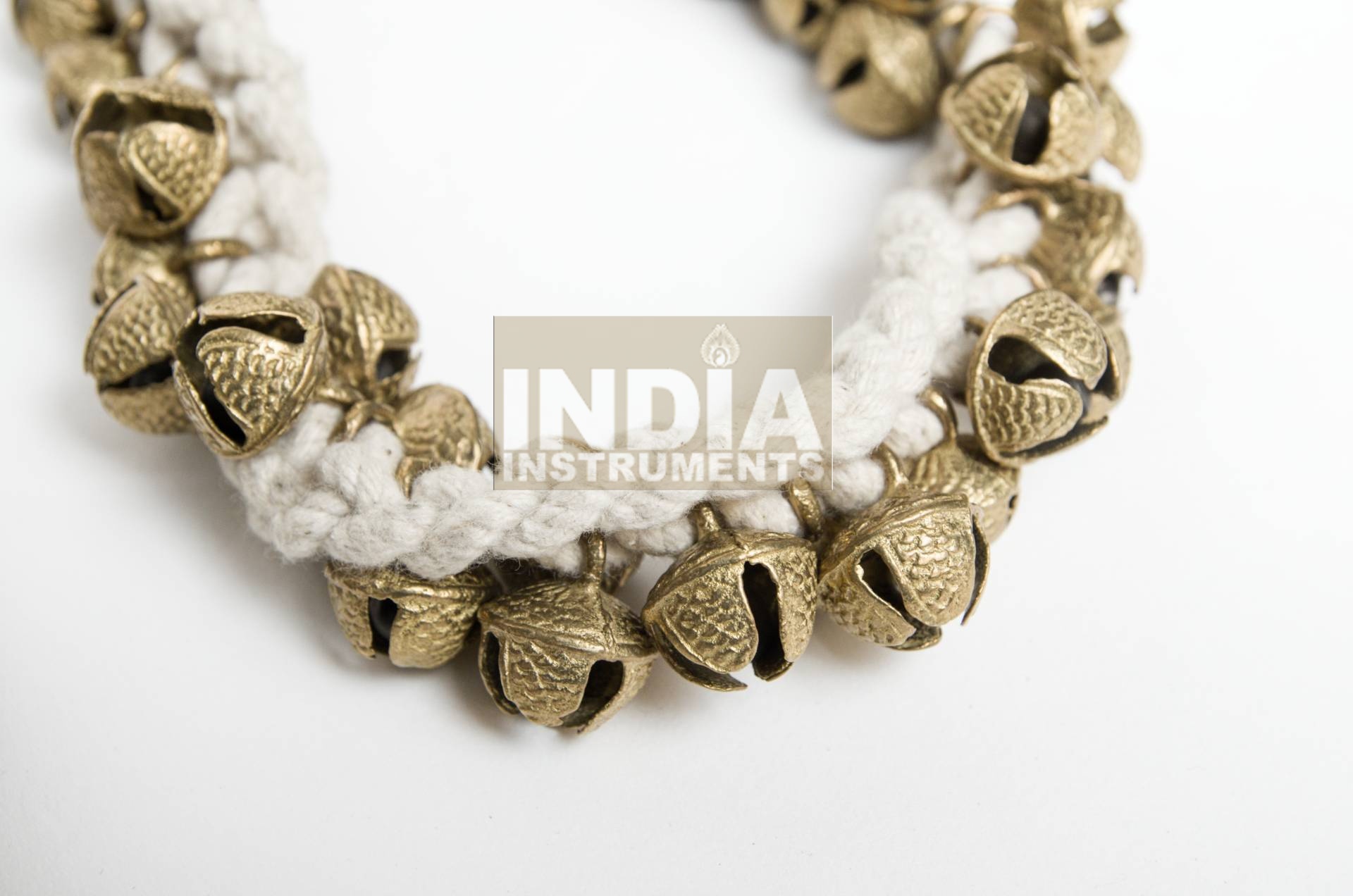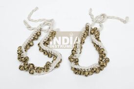 50 brass bells per foot, i.e. a total of 100 bells per pair, braided on white cotton cord.