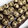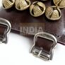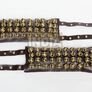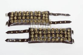 Three to four rows of six to ten brass bells per foot, i.e. a total of 48 to 80 bells per pair. Cuffs made of leather.