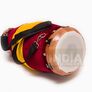The small side of the S.R.I. Krish Khol Karunya has a bell-like metallic sound and the big side a deep bass. Due to the unbreakable synthetic body the S.R.I. Krish Khol Karunya has a little less sustain than traditional clay khols though. On the other hand it is unbreakable and therefore very suitable for travelling. In traditional khols / mridanga the animal skin drum heads react very strongly to fluctuating temperature and humidity and must therefore be adjusted constantly. Moreover traditional drum heads wear out and therefore have to be replaced again and again with great effort. And vegans and vegetarians are bothered by the fact that animals are killed to produce the drum heads. All these problems are solved by Karunya's S.R.I. (Synthetic Indian Rhythm) Krish Khol, which is made entirely of synthetic materials and has a stainless steel tuning mechanism. The synthetic skins are so water-repellent that you can even wipe them with a damp cloth for cleaning. The easy to use tuning mechanism allows a very precise and very durable tuning. If a drum head is damaged or worn out after many years of playing, it can be replaced quickly and easily.