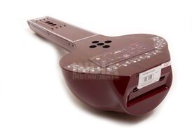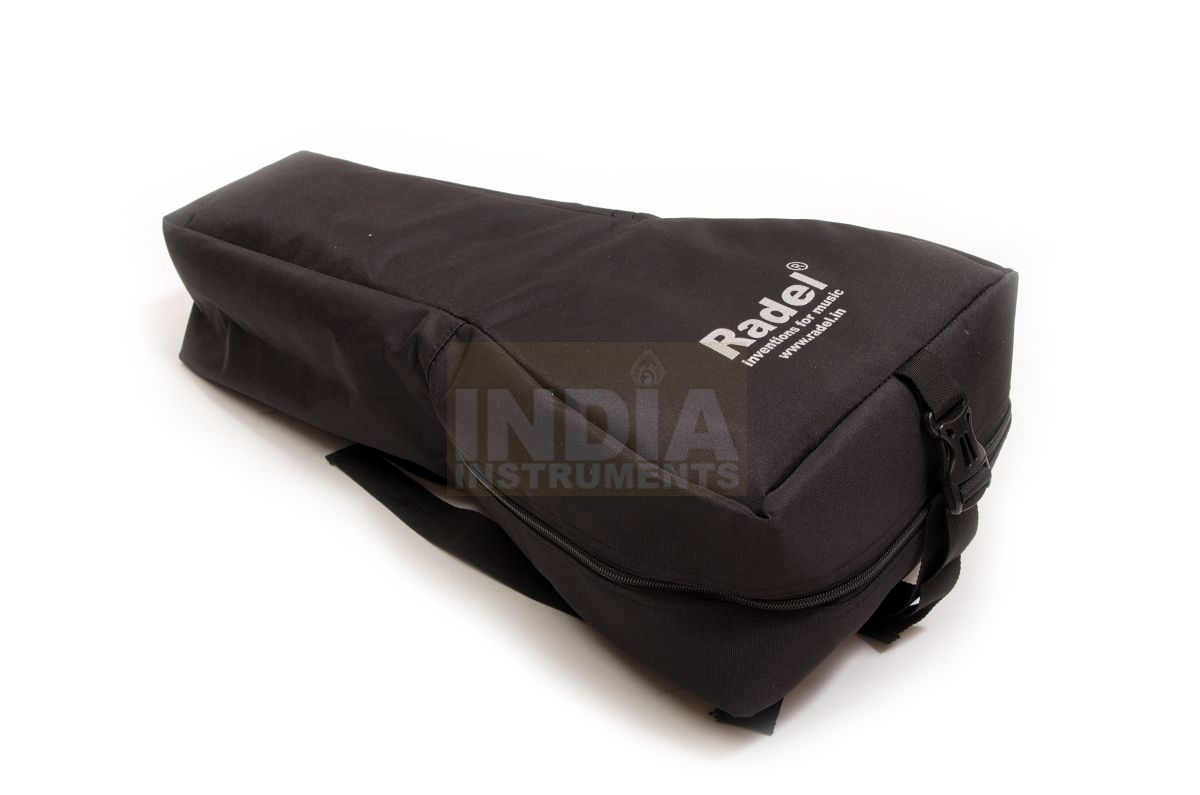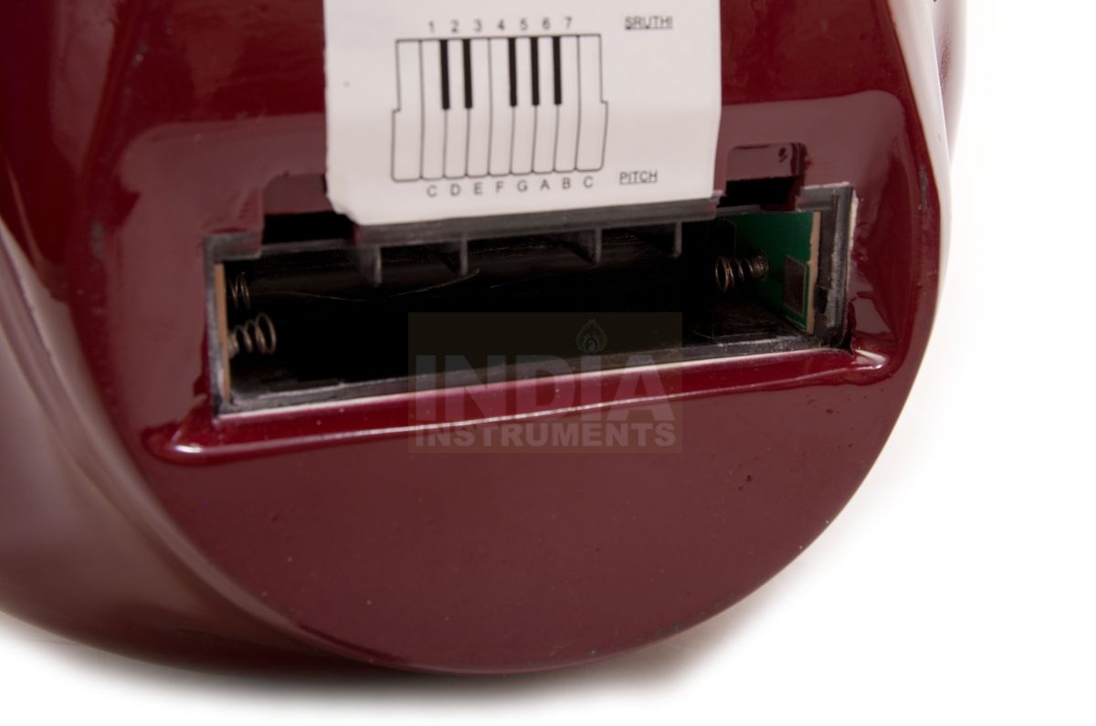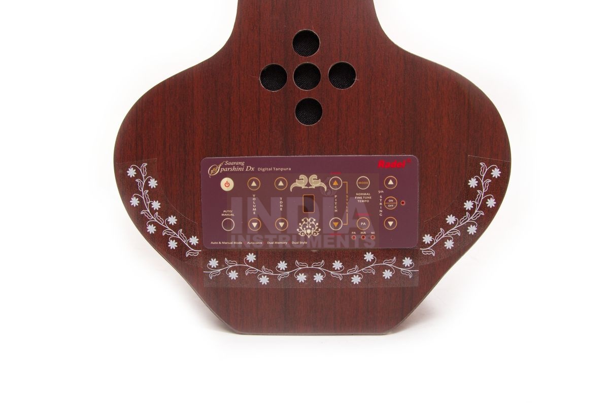 The sample technology of all Saarang e-tanpuras is identical. The audible sound therefore depends upon the integrated speakers. Saarang Sparshini has three speakers (two in the lower part and one in the upper part, nearly at ear level when sitting with crossed legs), producing a very rich, spacious and powerful sound. In spite of its size, the instrument can easily be dismantled and stored in the included case for travel.