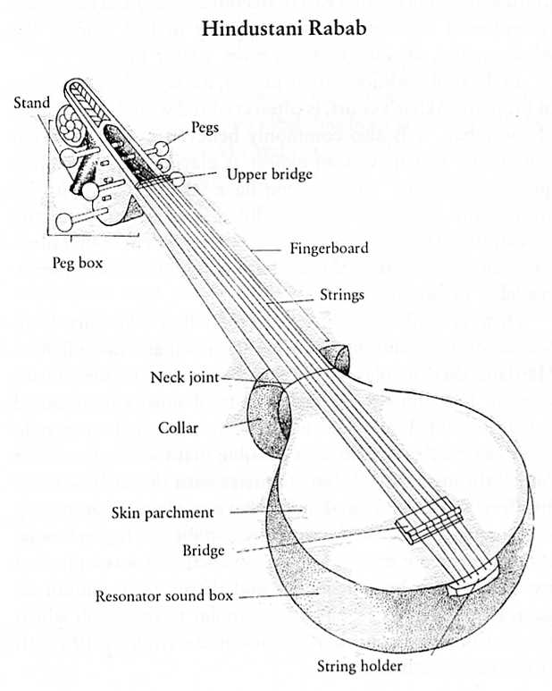 As far as we are aware, the earliest description of a musical instrument termed rabab has been given in the Kitab- al-Musiqi Al Kabir of Al-Farabi (AD 872-950). Al-Farabi says that this rabab is similar to the tanbur of Hurasan, a long- necked lute with a small bulging body, several frets on the fingerboard and two strings of the same thickness, which were plucked by means of a plectrum. Commonly five frets and sometimes more on the tambur of Hurasan were fixed, the others remained movable. This short lute when travelled westwards, became rebec and paved the way for the invention of the violin. The features of this Persian and Arabic rabab are quite similar to the Indian sarangi.