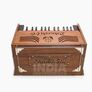 The Pakrashi Premium Mini offers particularly fine quality significantly less expensive than the comparable Paloma Companion. The 27 keys from f to g range over 2 1/4 octaves and thus cover the typical range of common mantras and kirtans. High-quality double reeds ensure good response and a warm, full sound. The silky-matt teak surfaces please eyes and hands alike. Precise workmanship ensures good fluency of the keyboard and long-term tightness of the air chambers. However, the Pakrashi Premium Mini has less air volume than normal sized harmoniums. Therefore, it needs more more action of the bellows when playing chords.