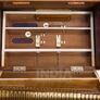 - removable wooden cover (jali) over key mechanism with carving and metal palm rest