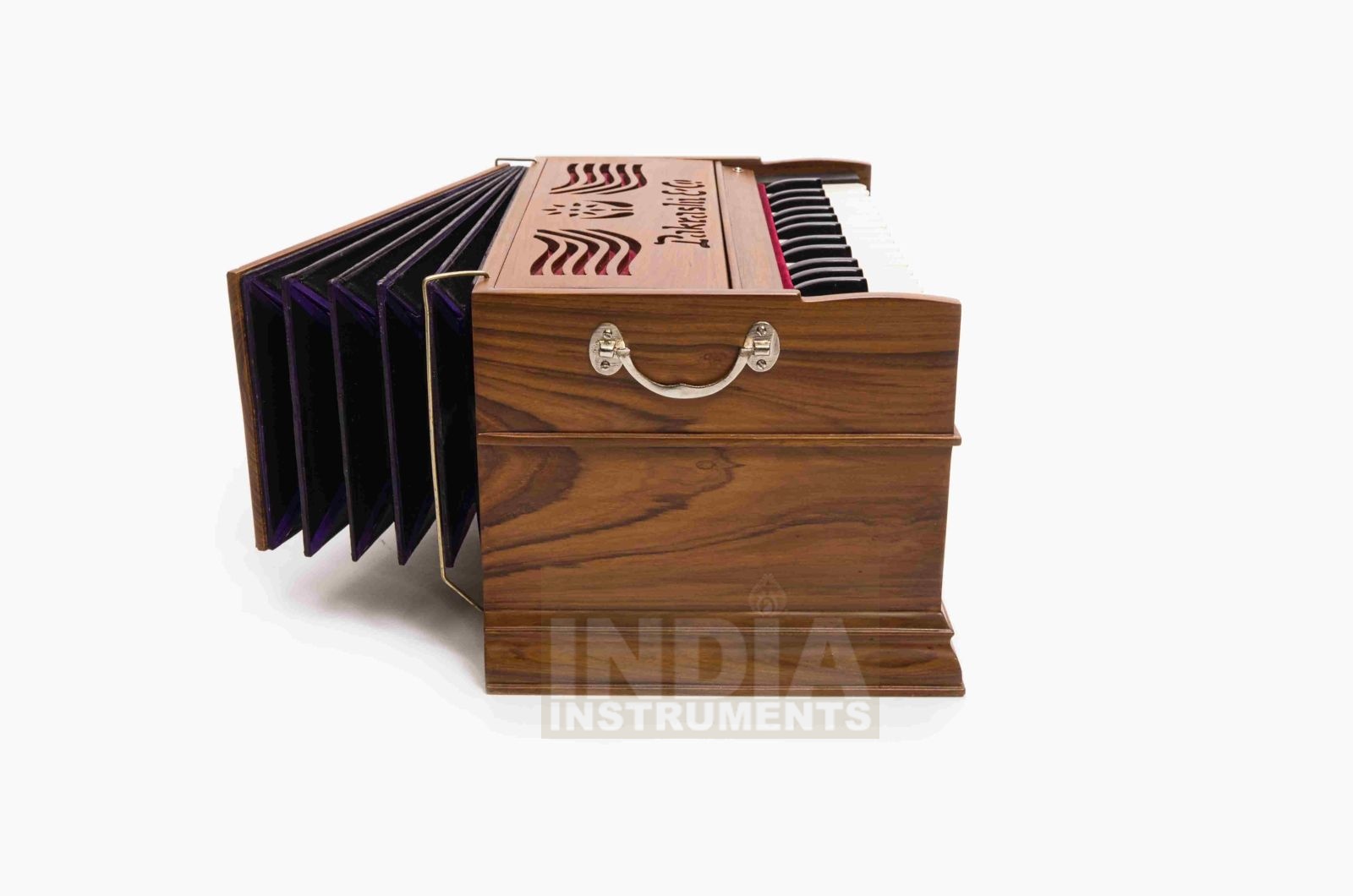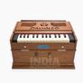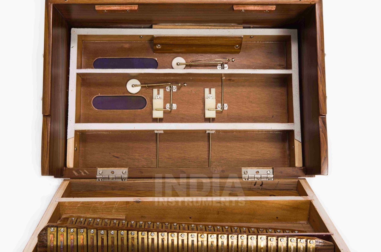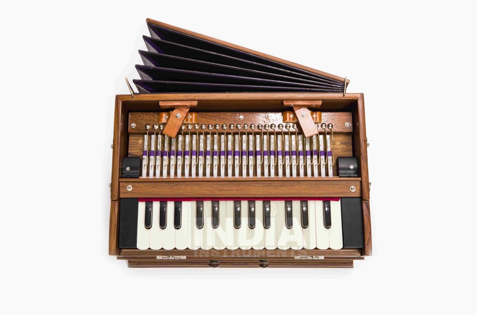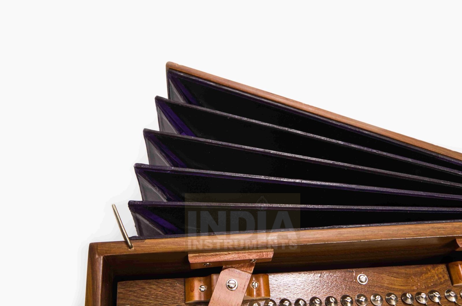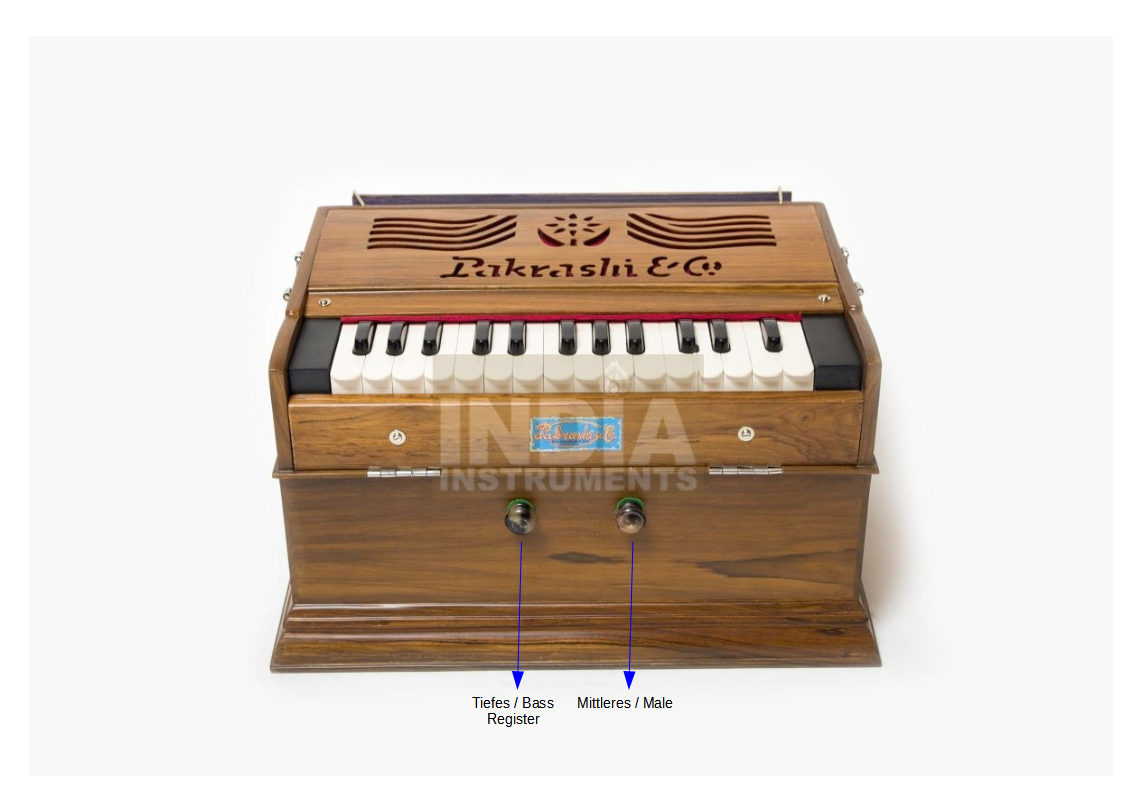 In India, our harmoniums are tuned to international concert pitch of a = 440 hertz. In Europe, however, they usually sound slightly higher at a = 441 to 442 Hertz due to the colder climate. The difference is small and not necessarily noticeable even to trained ears.