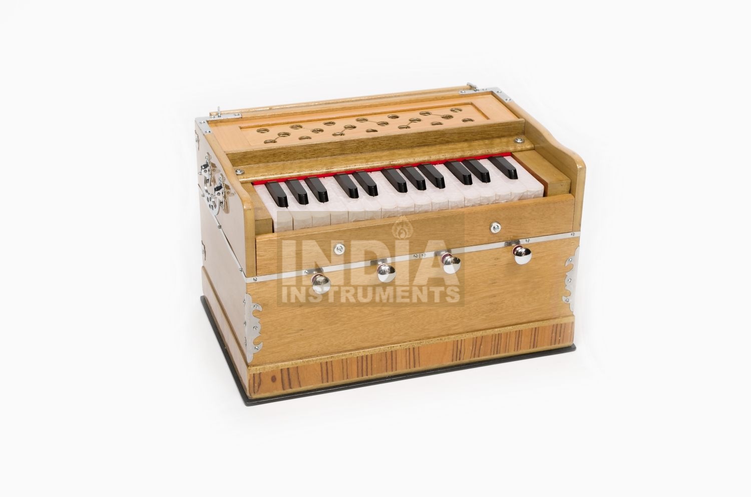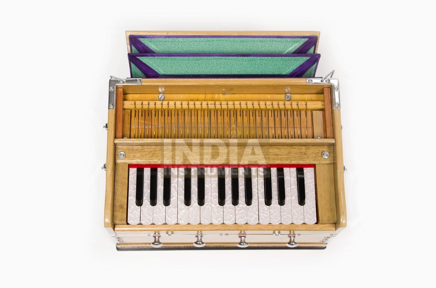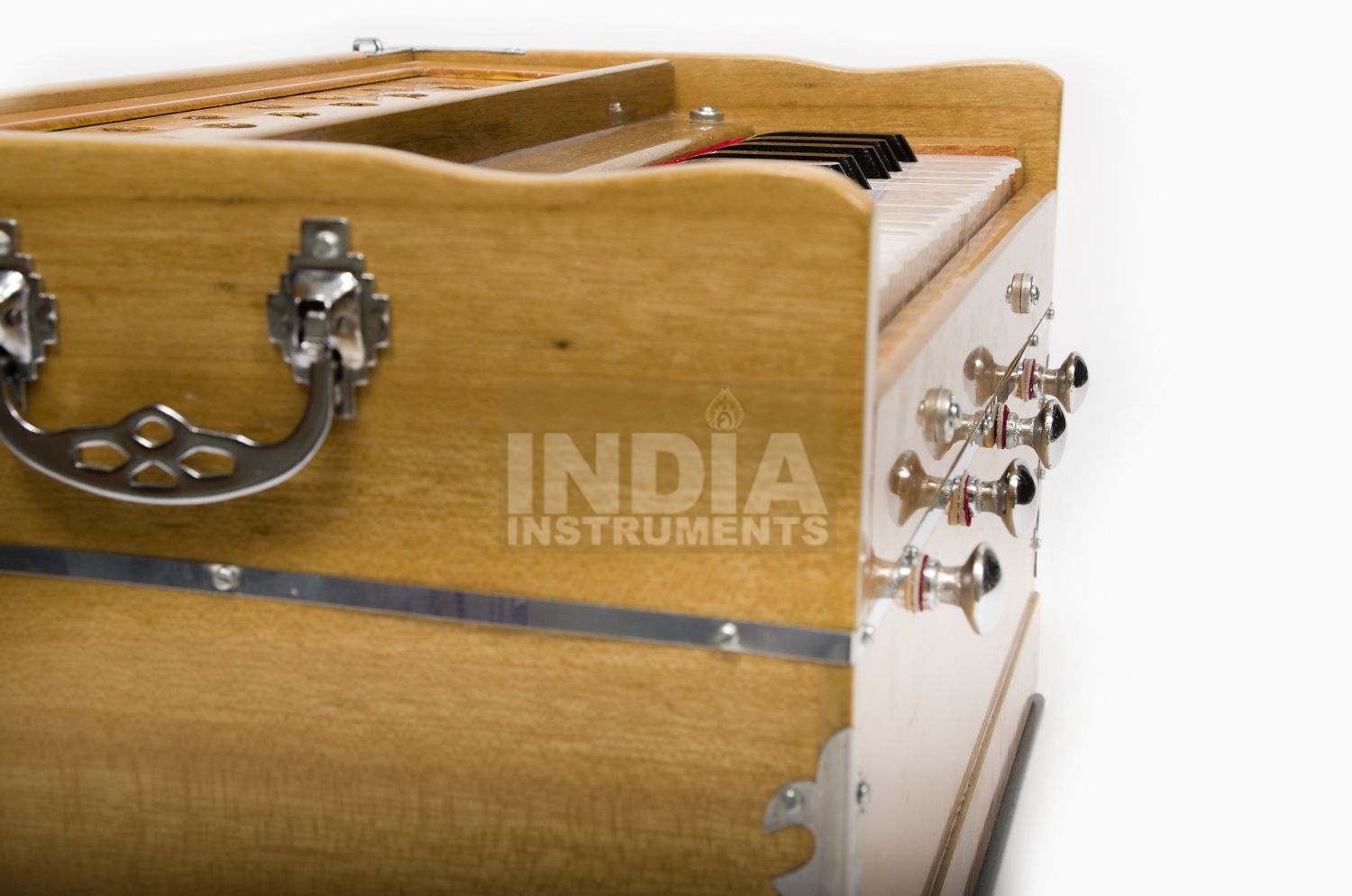 In India, our harmoniums are tuned to international concert pitch of a = 440 hertz. In Europe, however, they usually sound slightly higher at a = 441 to 442 Hertz due to the colder climate. The difference is small and not necessarily noticeable even to trained ears.