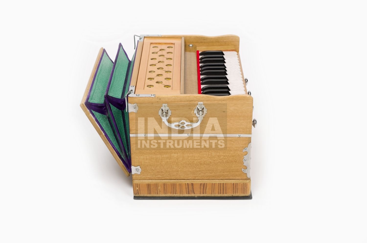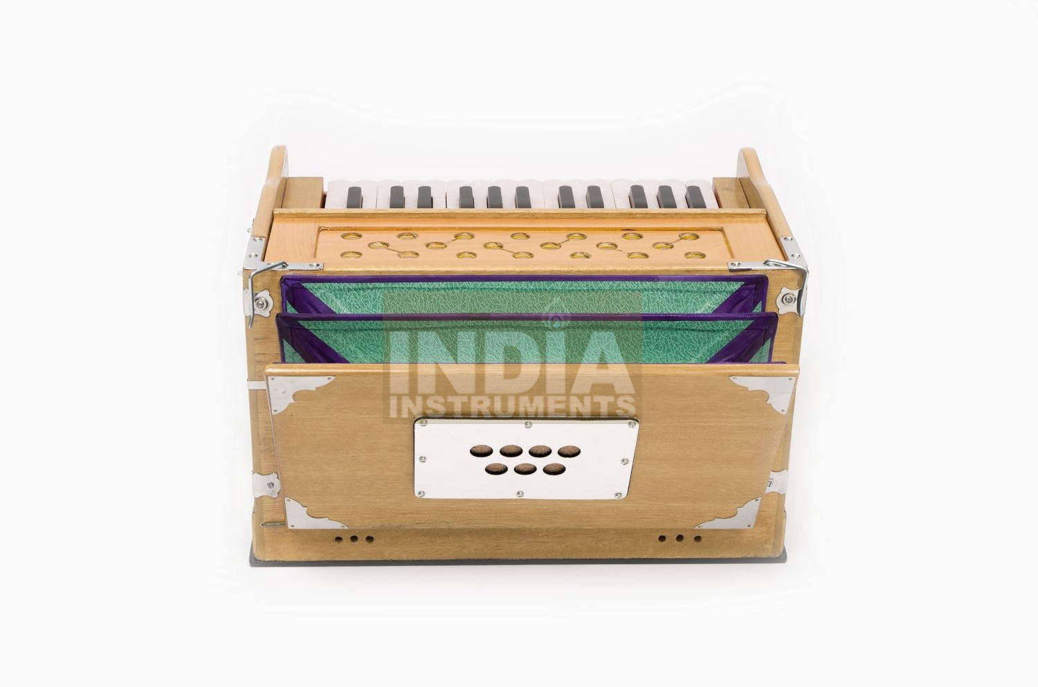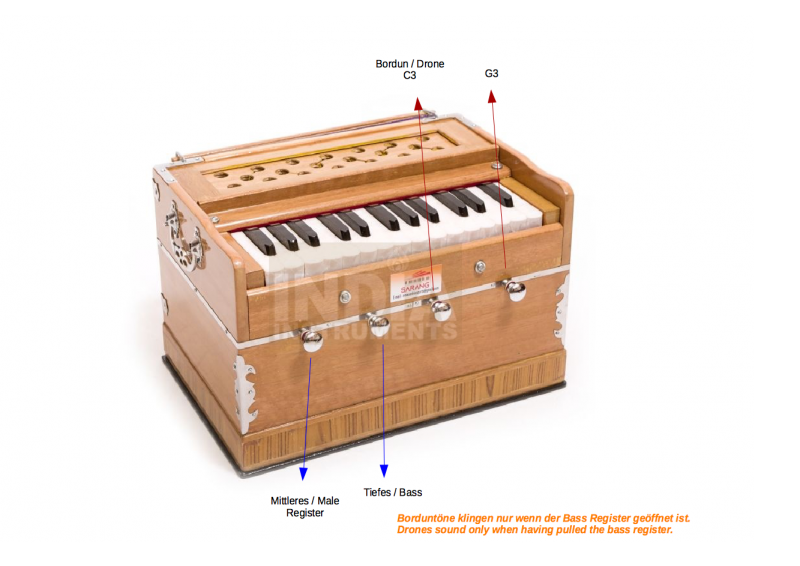 In India, our harmoniums are tuned to international concert pitch of a = 440 hertz. In Europe, however, they usually sound slightly higher at a = 441 to 442 Hertz due to the colder climate. The difference is small and not necessarily noticeable even to trained ears.