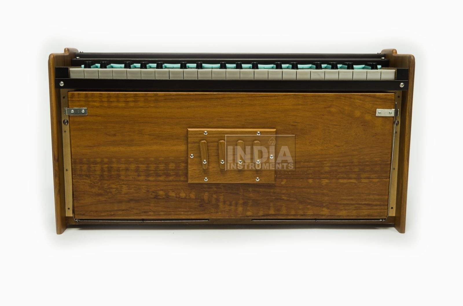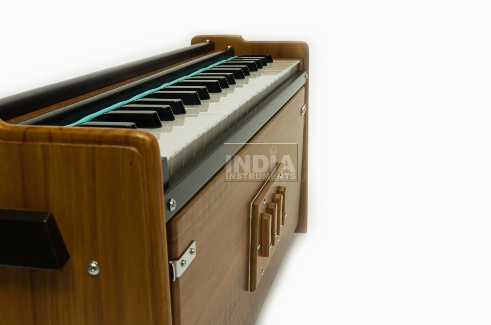 In India, our harmoniums are tuned to international concert pitch of a = 440 hertz. In Europe, however, they usually sound slightly higher at a = 441 to 442 Hertz due to the colder climate. The difference is small and not necessarily noticeable even to trained ears.