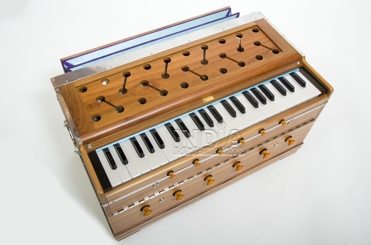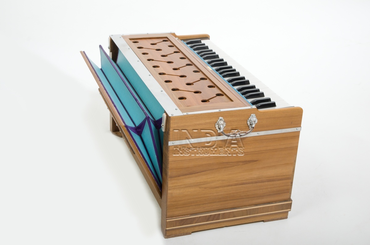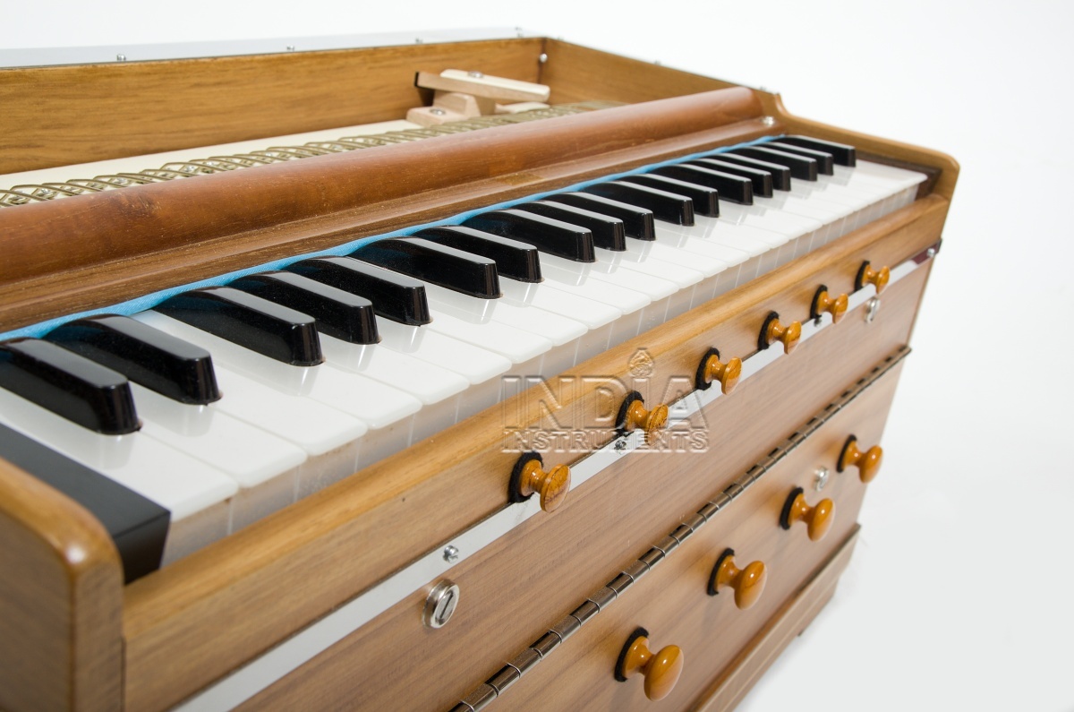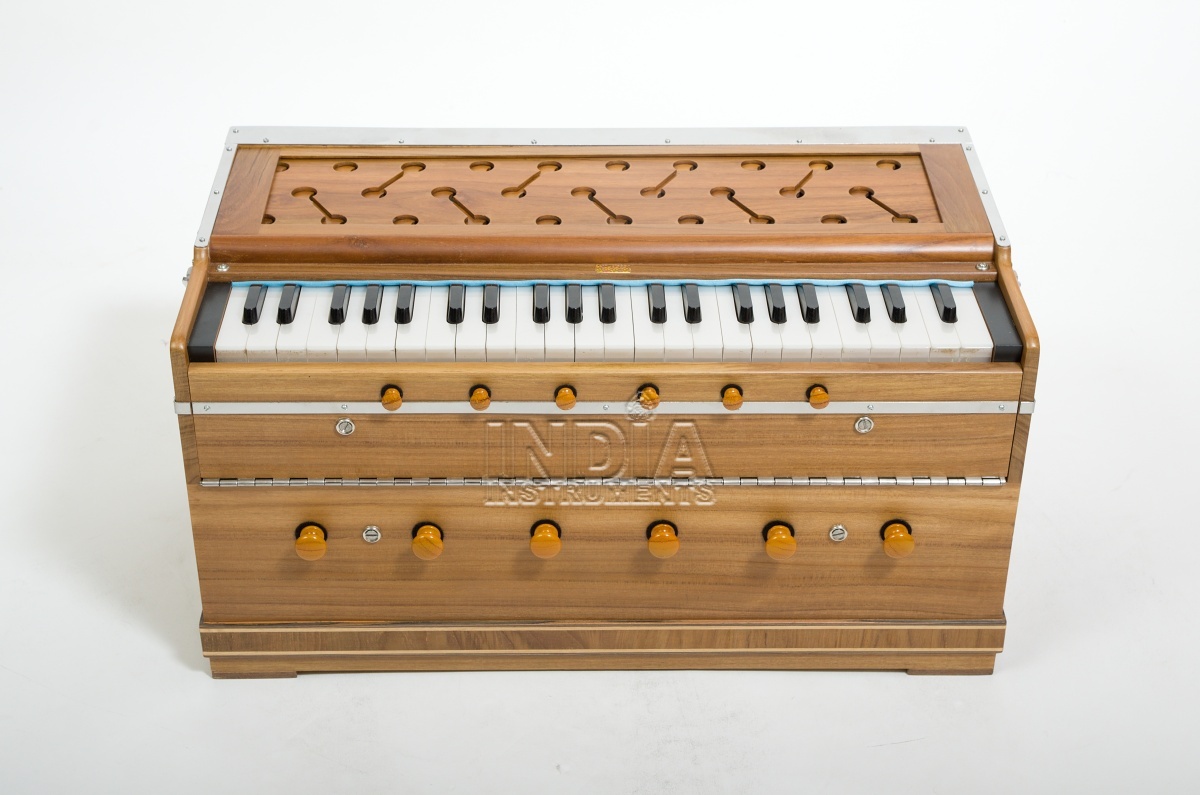 In India, our harmoniums are tuned to international concert pitch of a = 440 hertz. In Europe, however, they usually sound slightly higher at a = 441 to 442 Hertz due to the colder climate. The difference is small and not necessarily noticeable even to trained ears.