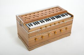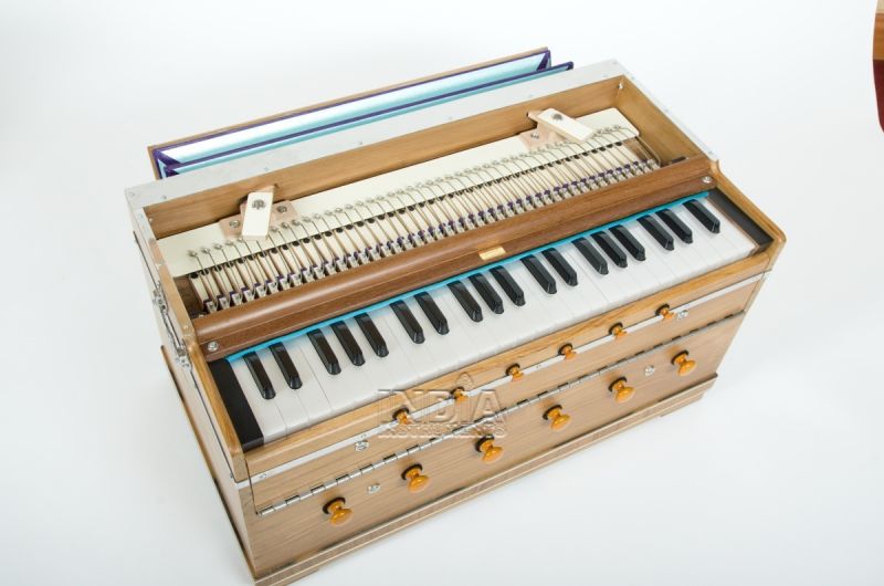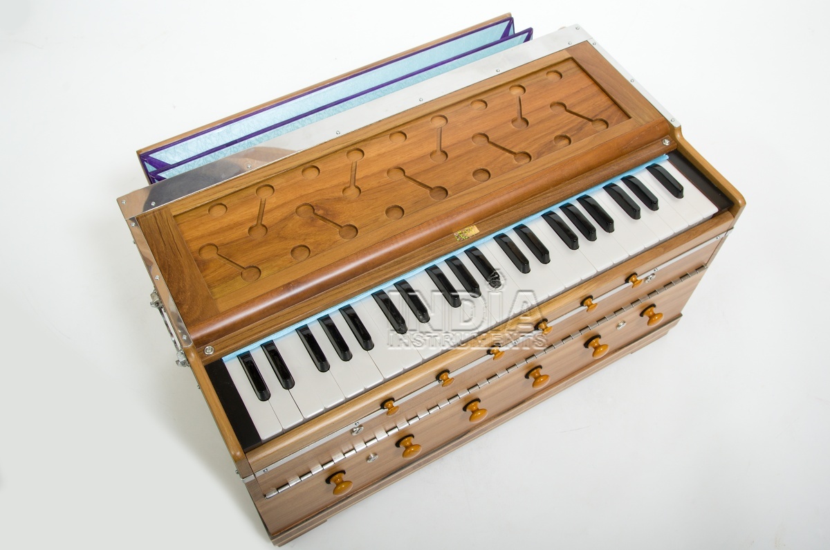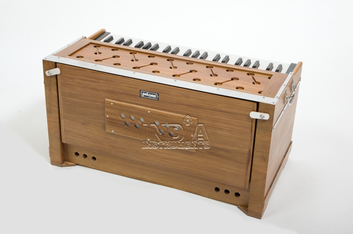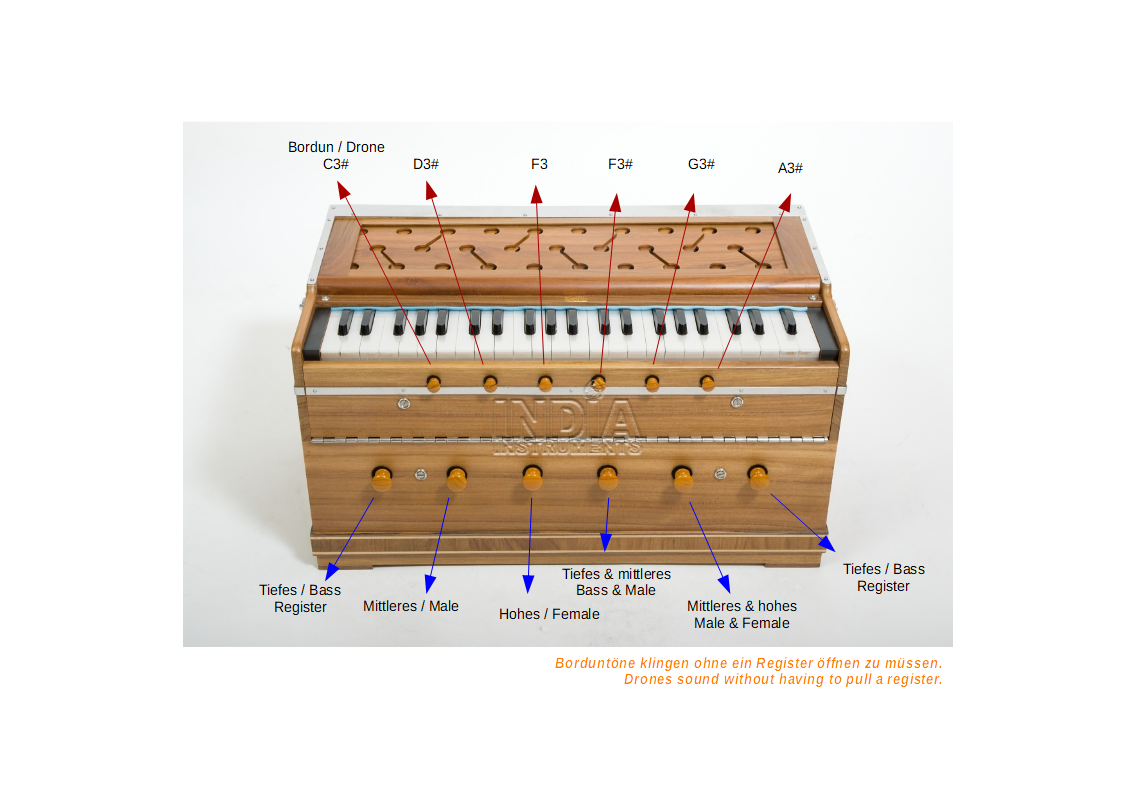 In India, our harmoniums are tuned to international concert pitch of a = 440 hertz. In Europe, however, they usually sound slightly higher at a = 441 to 442 Hertz due to the colder climate. The difference is small and not necessarily noticeable even to trained ears.