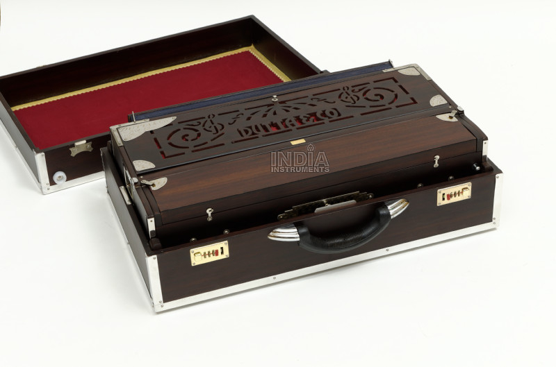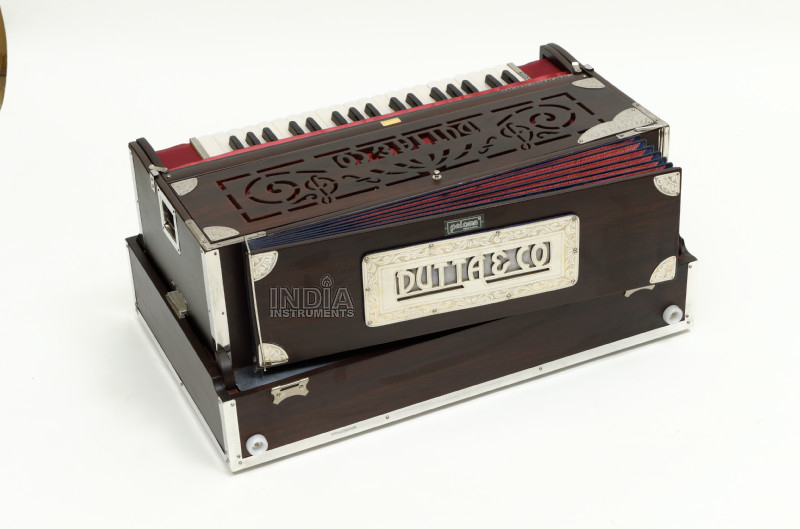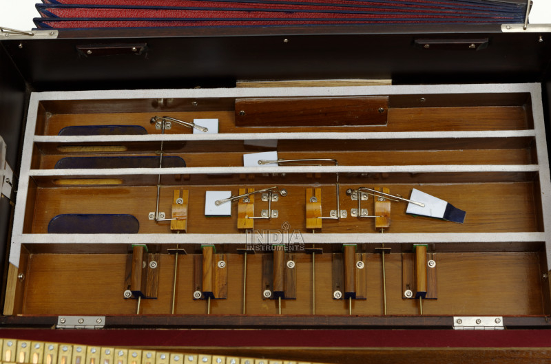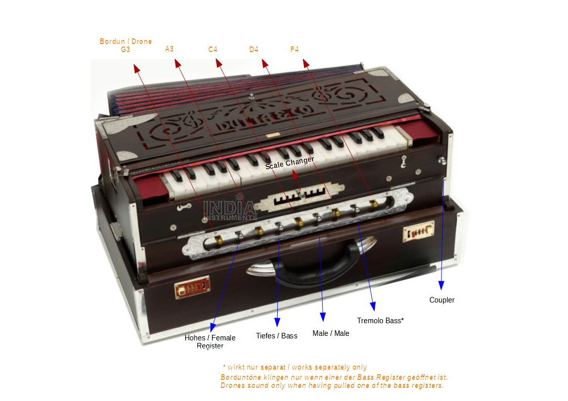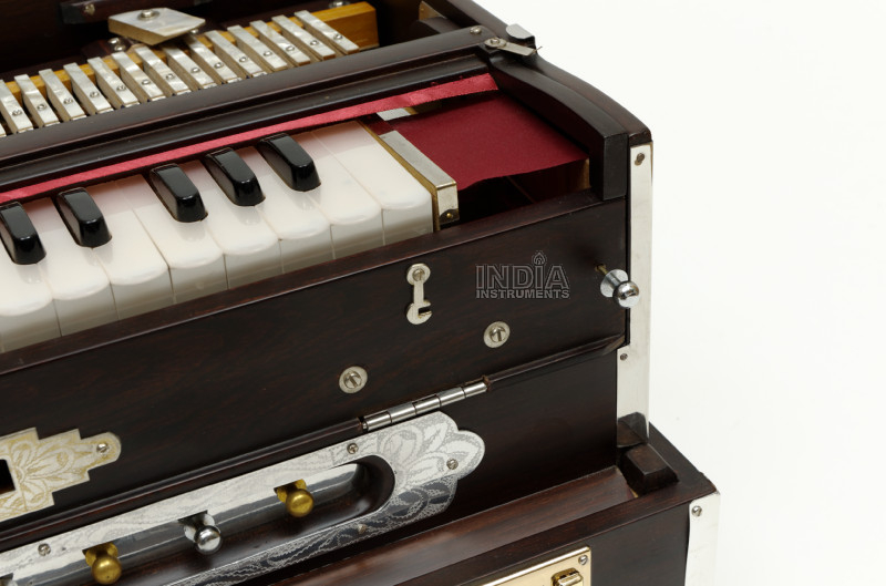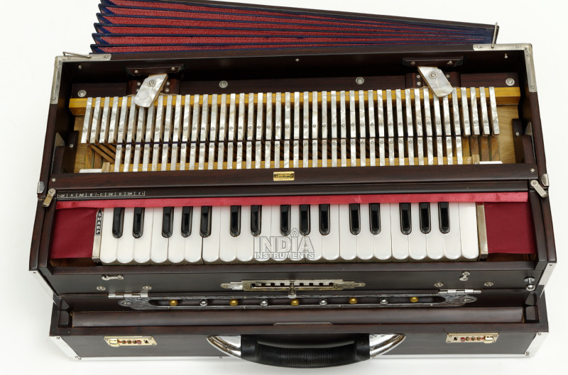 In India, our harmoniums are tuned to international concert pitch of a = 440 hertz. In Europe, however, they usually sound slightly higher at a = 441 to 442 Hertz due to the colder climate. The difference is small and not necessarily noticeable even to trained ears.