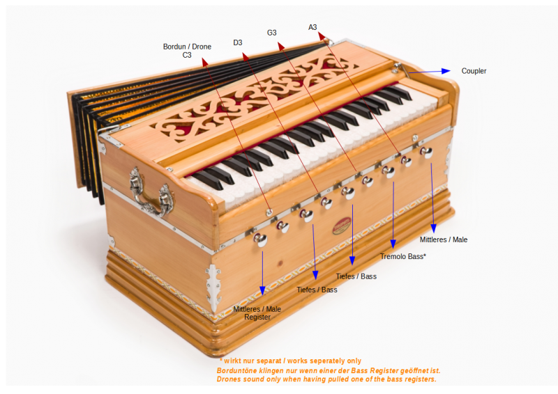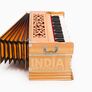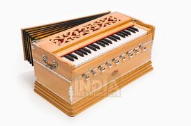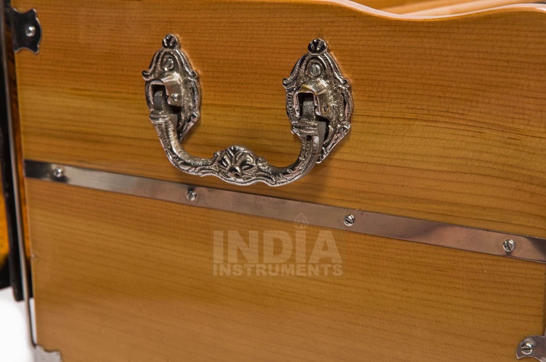 In India, our harmoniums are tuned to international concert pitch of a = 440 hertz. In Europe, however, they usually sound slightly higher at a = 441 to 442 Hertz due to the colder climate. The difference is small and not necessarily noticeable even to trained ears.