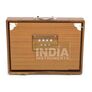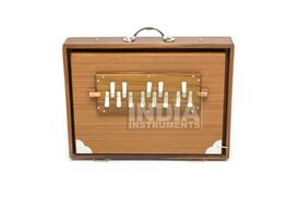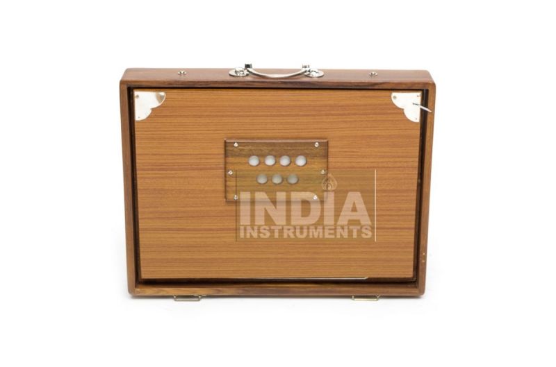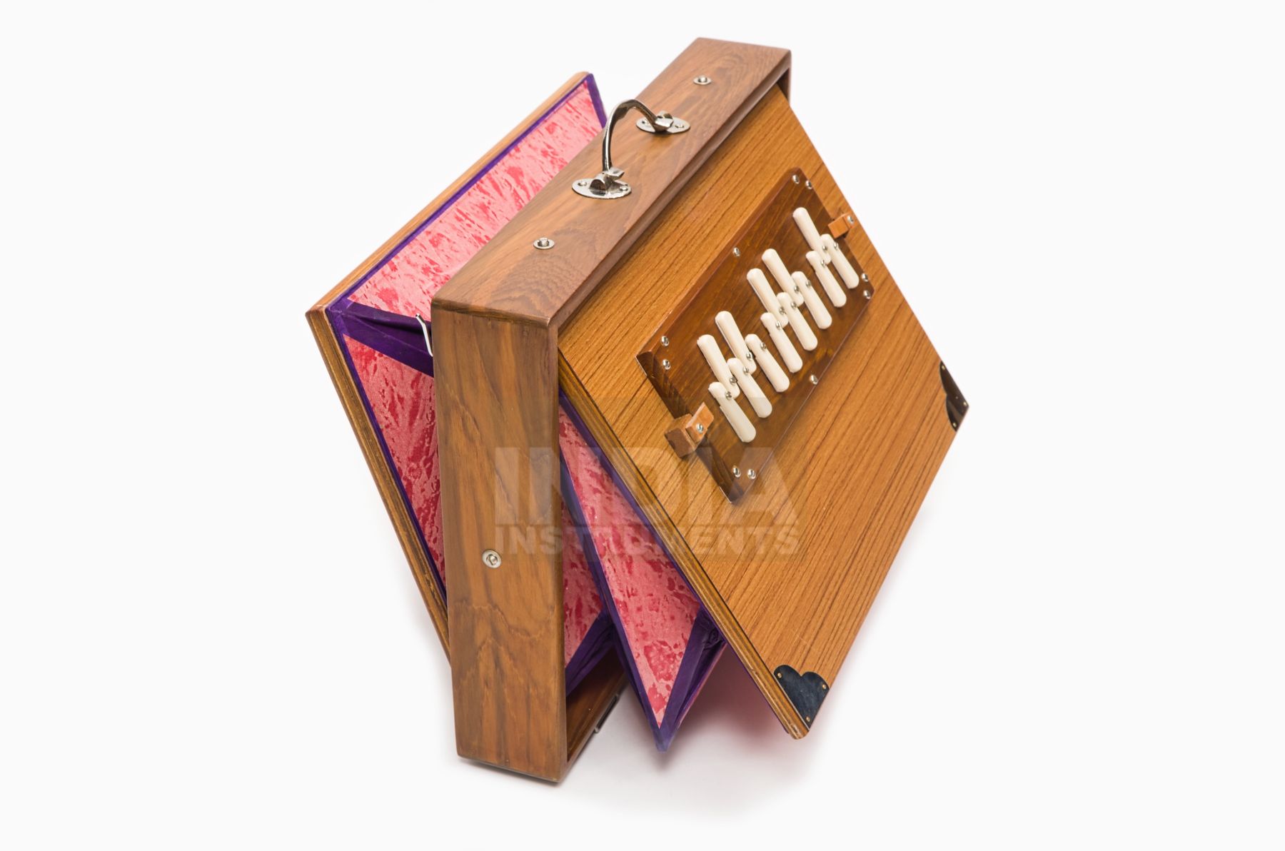 The large frame provides a much larger bellows volume as compared to smaller models, which permits an accurate dosing of air supply. In this way, the sound can be kept constant effortlessly even when three notes are played simultaneously. Additionally, the volume can be varied considerably wider and finer from evenly tender and low to constantly powerful loud. The larger resonating chamber provides moreover for a somewhat fuller overall sound. Despite its larger dimensions and heaviness, MKS shrutibox large can still be taken around without any difficulty. Only if you have to carry a lot of other stuff and if you are travelling by public transport or by foot, shape and weight might become inconvenient.