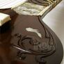 Dark stained toon wood, high polished shellac surfaces, 6 playing strings (tonal range of three octaves), 7 playing pegs, 12 sympathetic strings, inlays made of celluloid and mother of pearl imitation, plain base of the neck, synthetic bridges, brass string holder, no upper sound box. The sympathetic strings are guided into the neck at an obtuse angle over tear-proof mini-bridges, reducing the tendency of the strings to break.