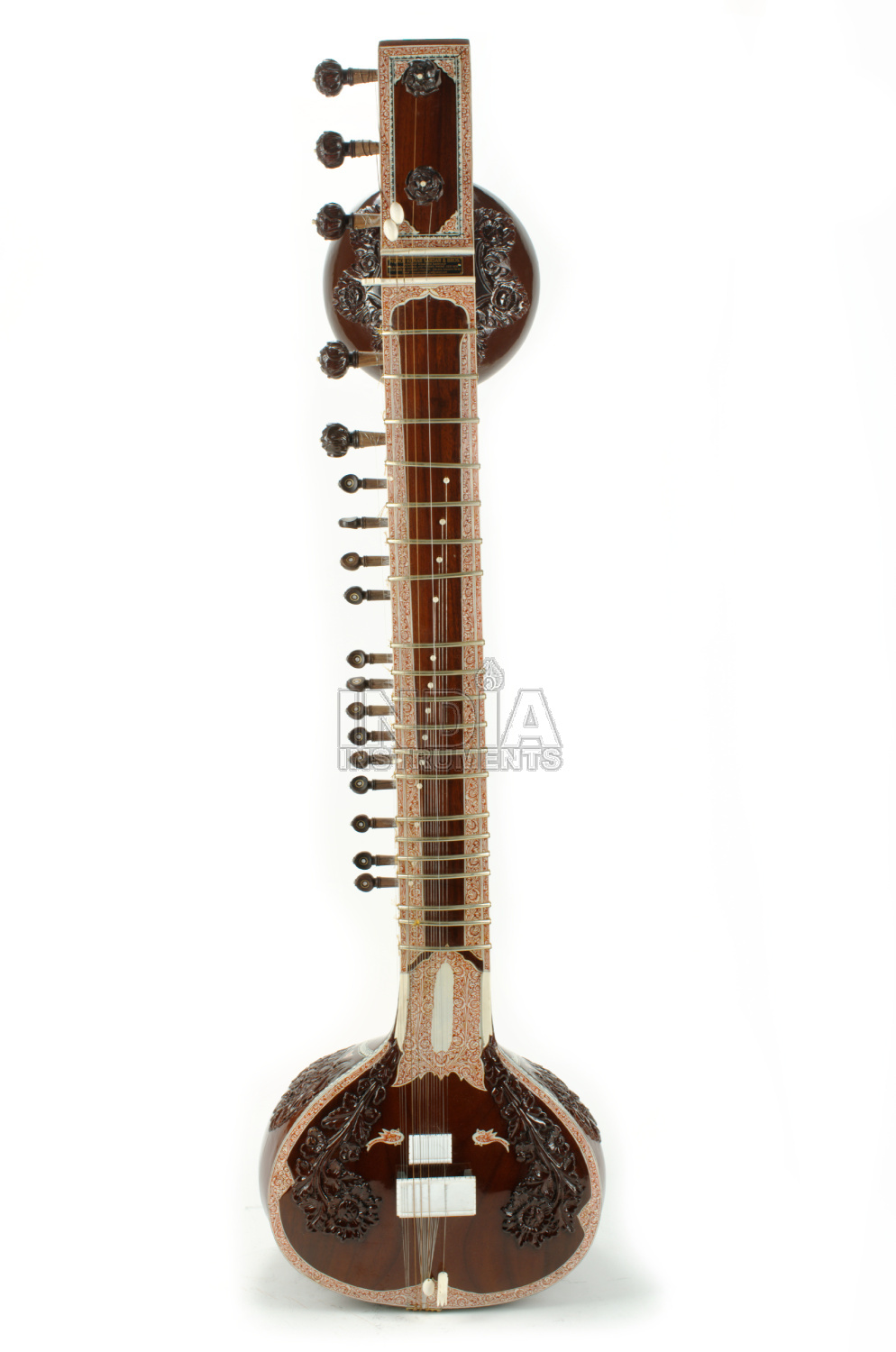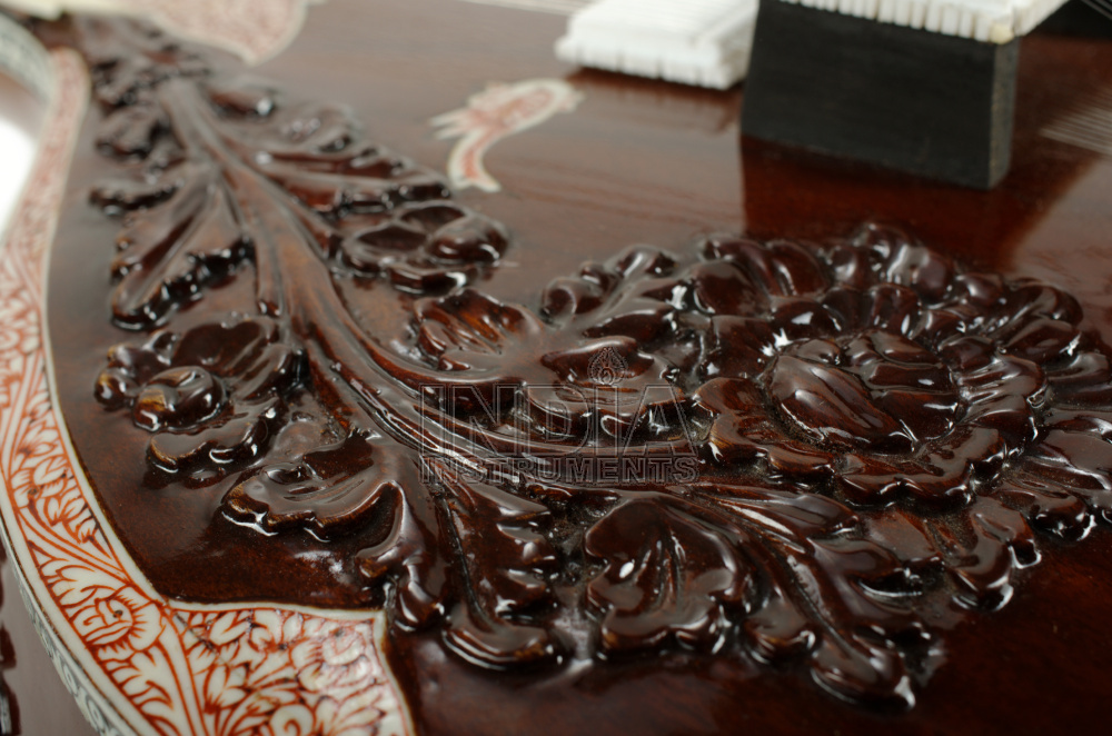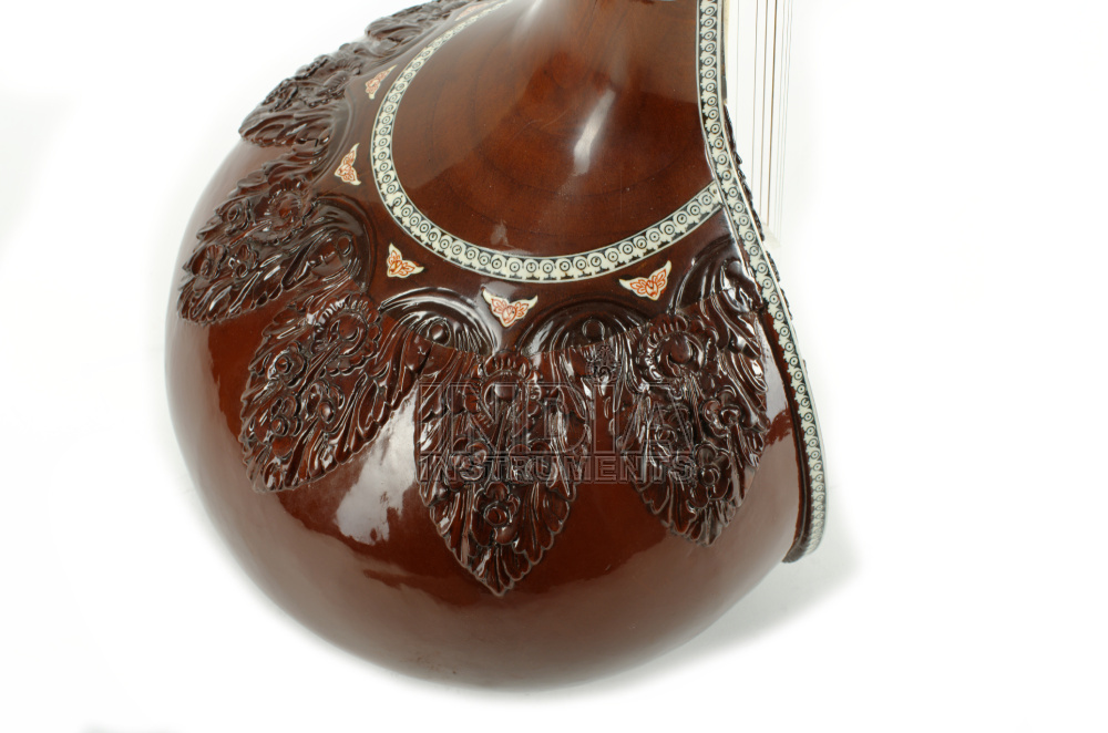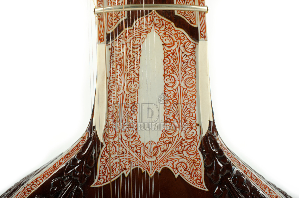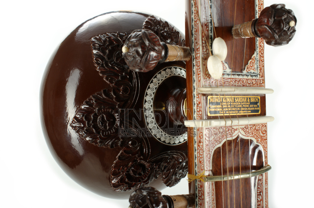 Stained medium brown toon wood, high polished synthetic varnish surfaces, 7 playing strings (tonal range of four octaves), 13 sympathetic strings, rich inlay work of celluloid with stained reddish-brown engravings, base of neck partly carved in gulab patta style, removable wooden upper sound box (tumba), plastic bridges, blossom pegs. Two hooks at the uppermost fret allow an 'unhooking' of the two lowest playing strings, preventing them from legg stricken unintentionally whilst playing fast and vigorously in a medium or high register, which would then create a dark or blurring sound. The sympathetic strings are guided into the neck at an obtuse angle over tear-proof mini-bridges, reducing the tendency of the strings to break.