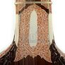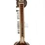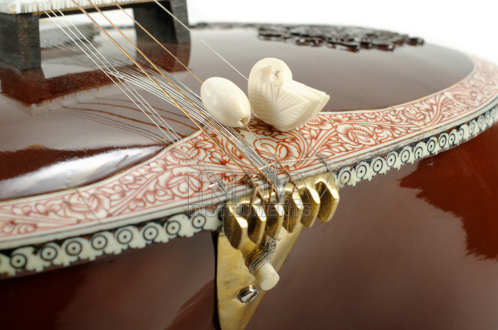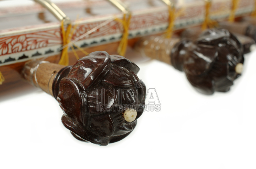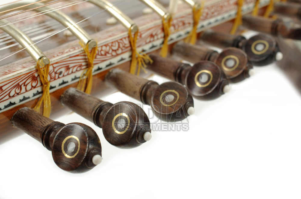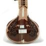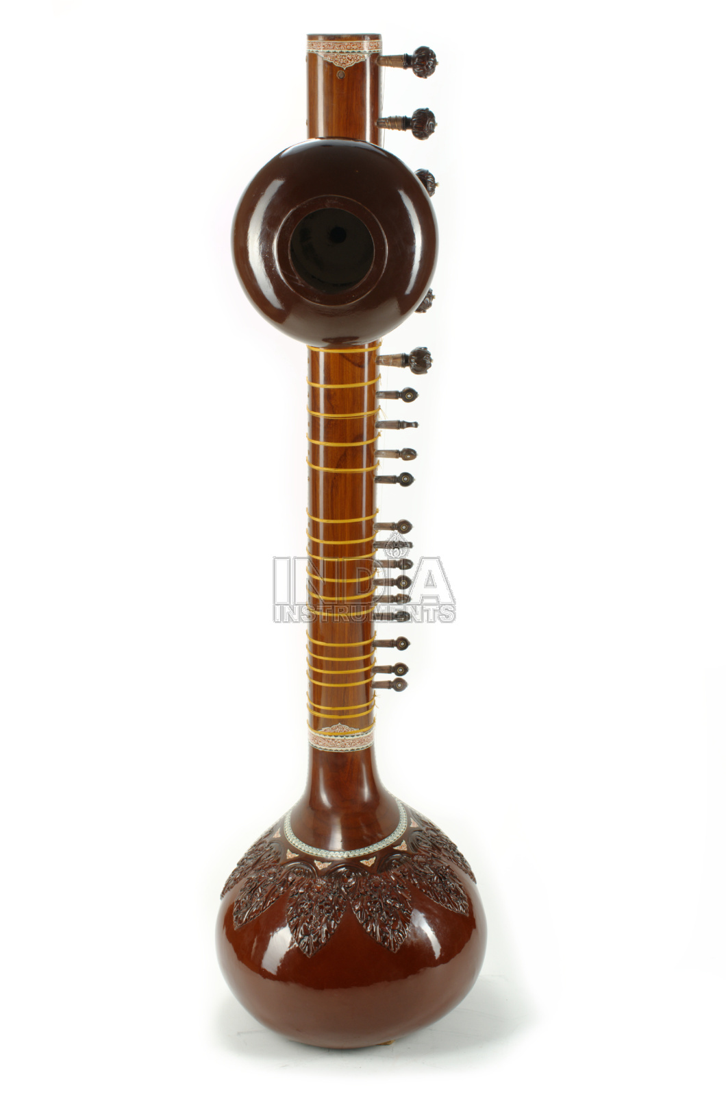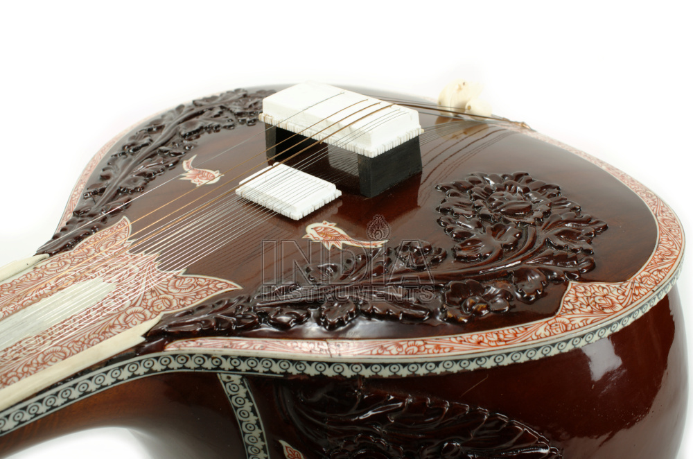 Stained medium brown toon wood, high polished synthetic varnish surfaces, 7 playing strings (tonal range of four octaves), 13 sympathetic strings, rich inlay work of celluloid with stained reddish-brown engravings, base of neck partly carved in gulab patta style, removable wooden upper sound box (tumba), plastic bridges, blossom pegs. Two hooks at the uppermost fret allow an 'unhooking' of the two lowest playing strings, preventing them from legg stricken unintentionally whilst playing fast and vigorously in a medium or high register, which would then create a dark or blurring sound. The sympathetic strings are guided into the neck at an obtuse angle over tear-proof mini-bridges, reducing the tendency of the strings to break.