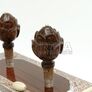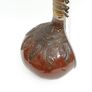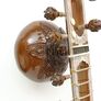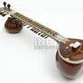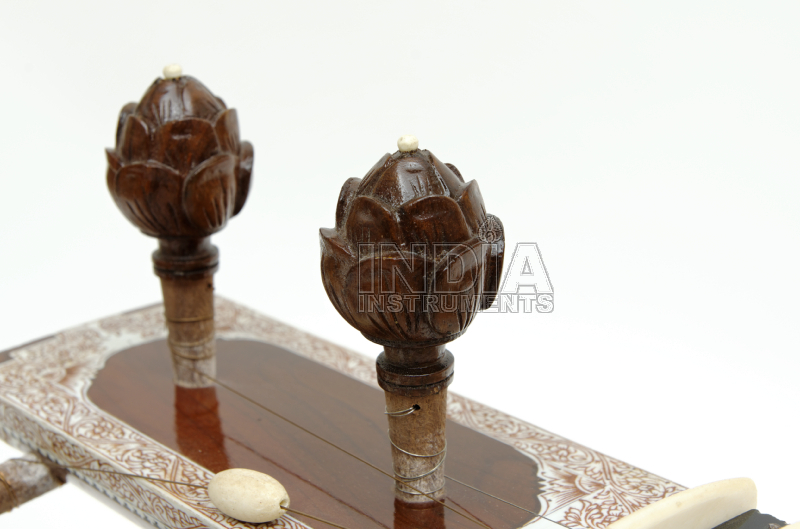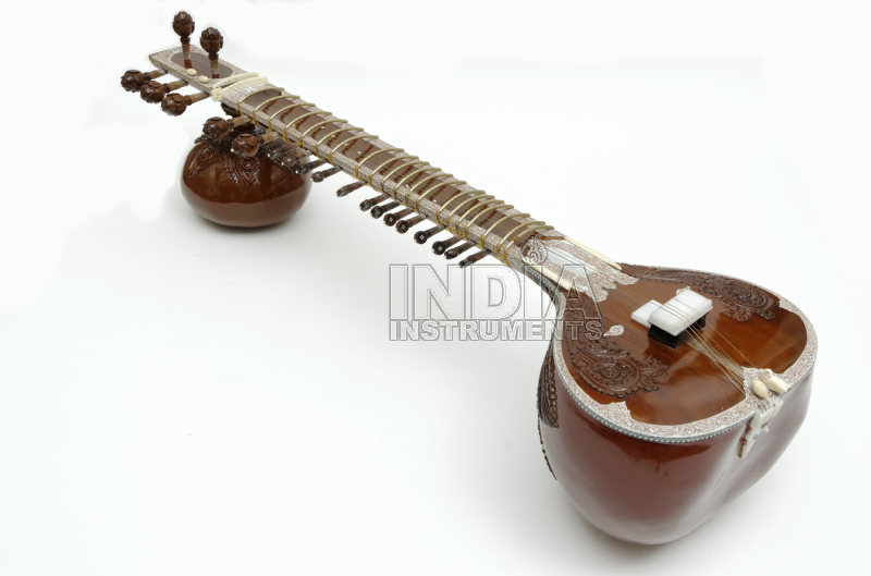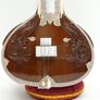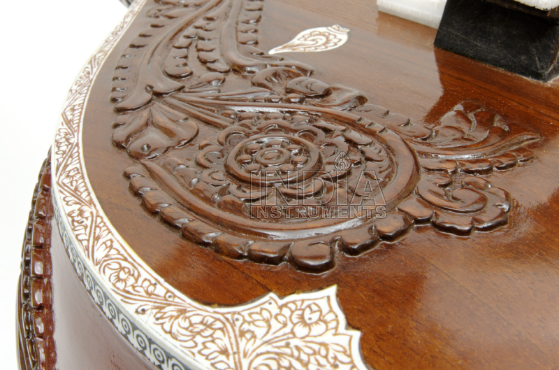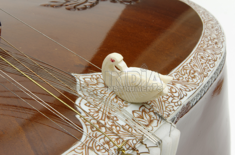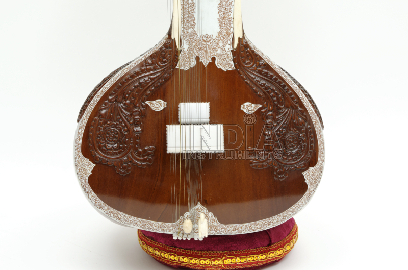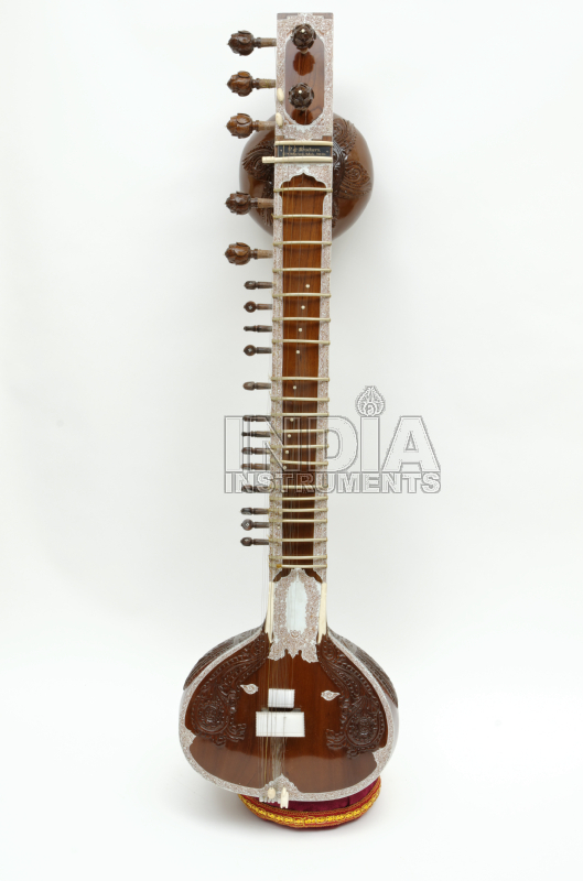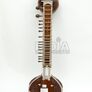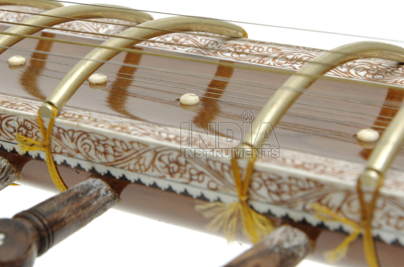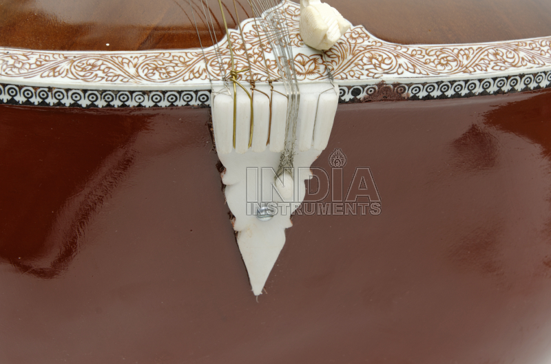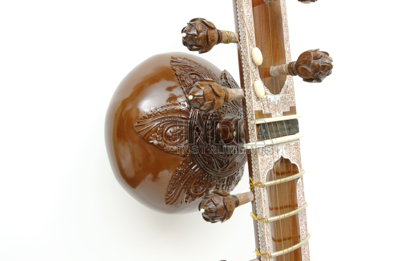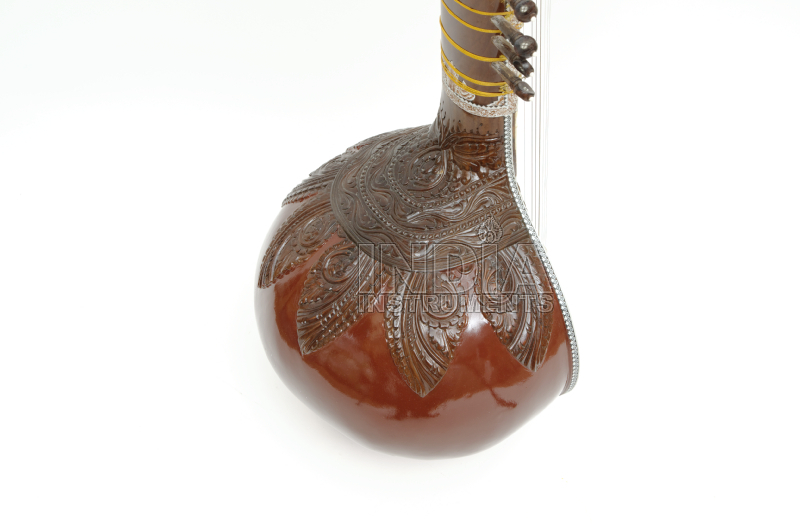Stained medium brown toon wood, high polished shellac surfaces, 7 playing strings (tonal range of four octaves), 13 sympathetic strings, rich inlay work of celluloid with stained brown engravings, base of neck fully carved in angur patta style, removable upper pumpkin sound box (tumba), plastic bridges, blossom pegs. Two hooks at the uppermost fret allow an 'unhooking' of the two lowest playing strings, preventing them from legg stricken unintentionally whilst playing fast and vigorously in a medium or high register, which would then create a dark or blurring sound. The sympathetic strings are guided into the neck at an obtuse angle over tear-proof mini-bridges, reducing the tendency of the strings to break.