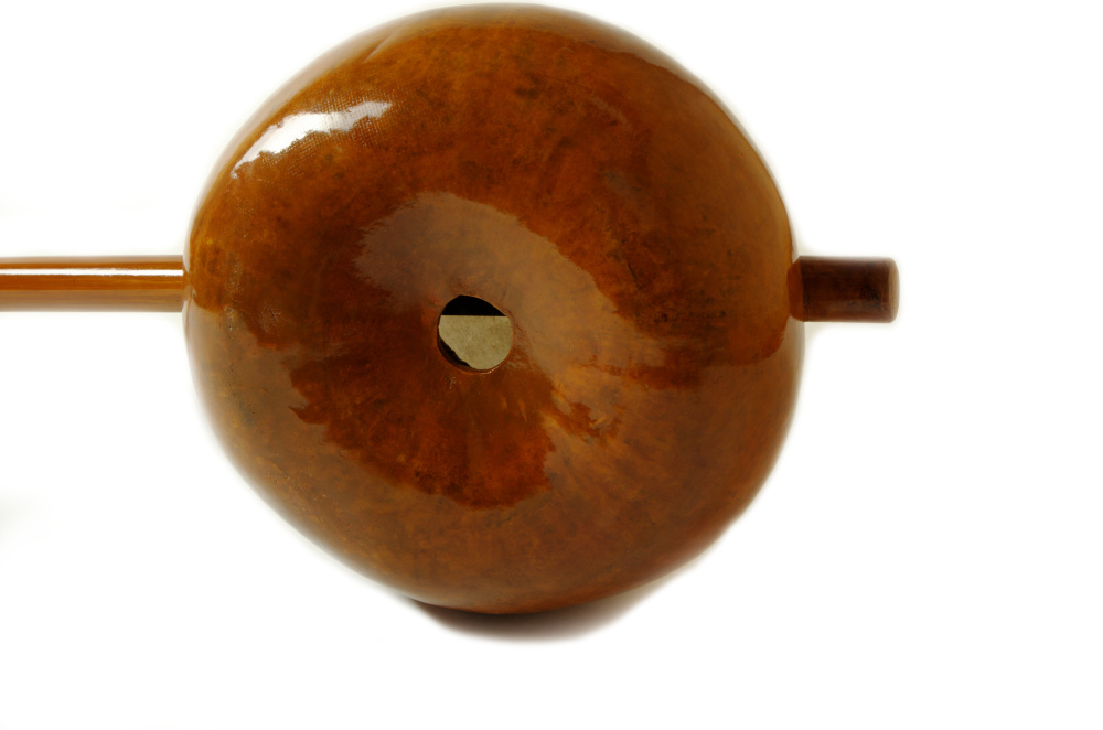 The body of our North Indian dotara bhajan is made of dried gourd. Its top side is cut off and covered with goatskin, like a sarod, dilruba, esraj or sarangi. On the skin there is a small wooden bridge that carries the strings. The neck of the instrument is a long straight wooden bar that goes right through the gourd. The strings are attached to its short end, and its long end carries the two pegs for tuning. The back of the gourd has several small resonating holes.