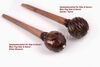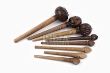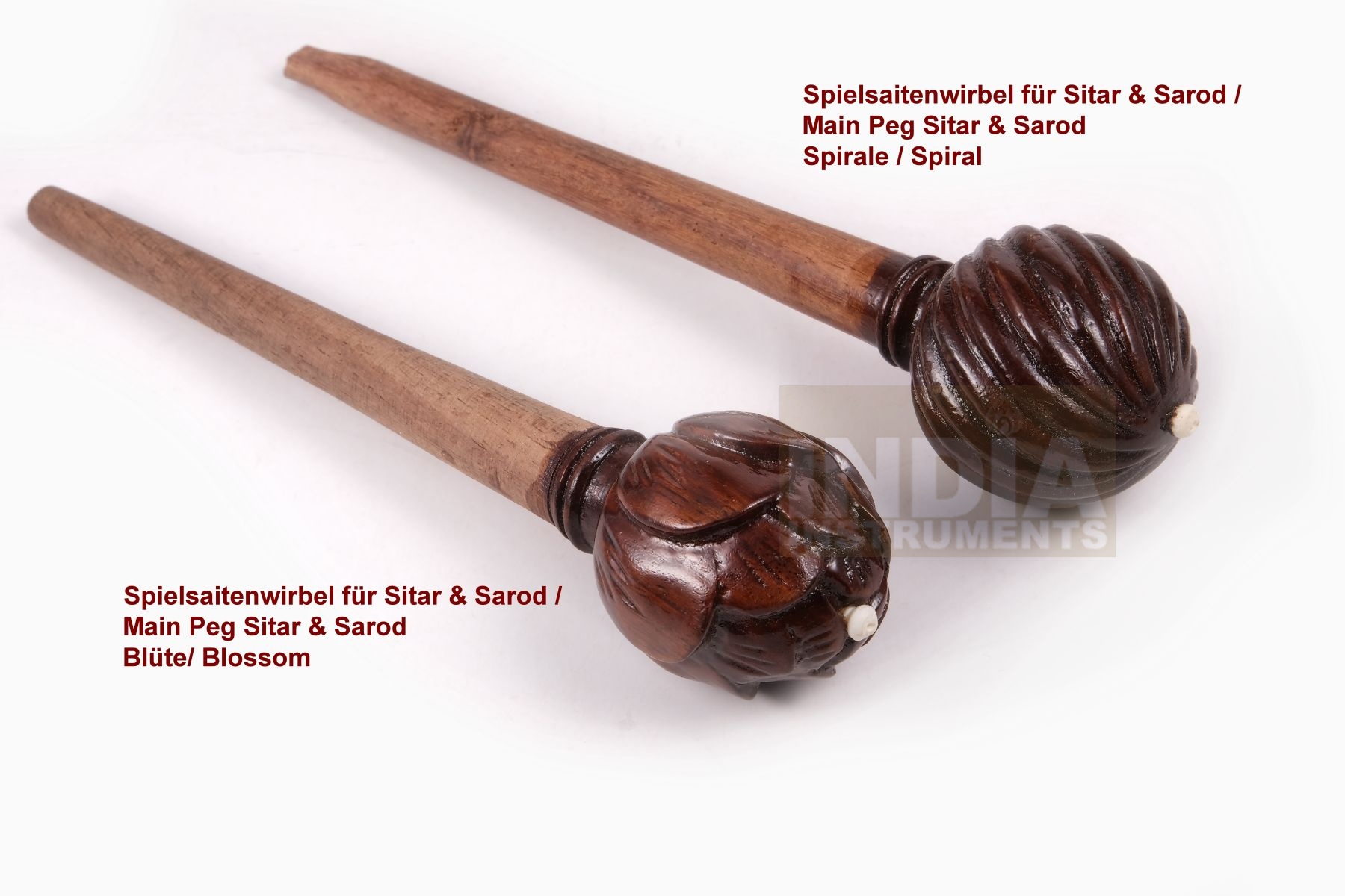 Our peg blanks for Indian string instruments are made in one piece from hardwood. They consist of a conic bar, which is stuck inside the instrument, and a broad carved head, which is gripped for moving the peg. The different labellings refer to the shape of the head. The spiral peg has a spiral-shaped head, and the blossom peg's head is carved like a blossom.