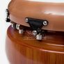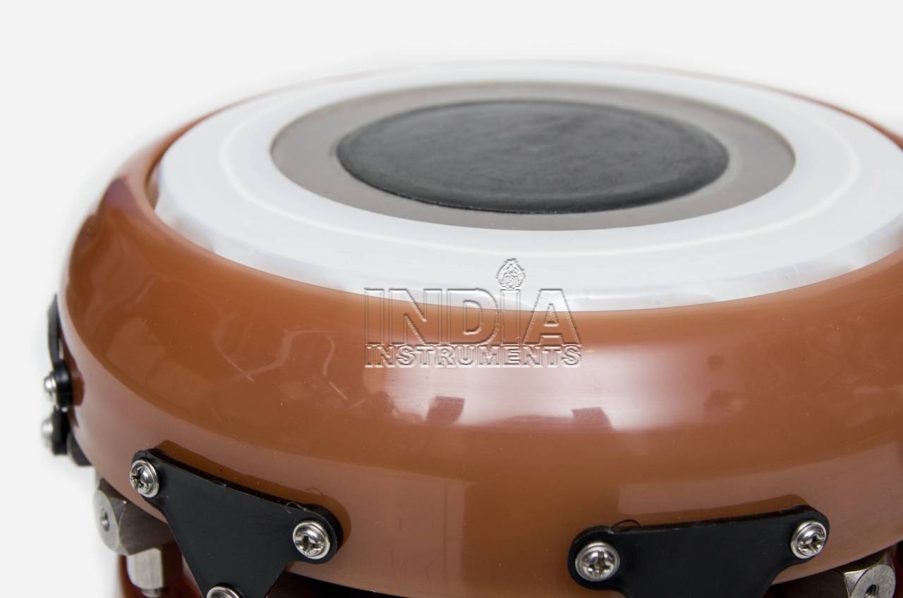 Traditional tabla heads are made of animal skins and react strongly even to slight changes in temperature and humidity. Therefore they must be tuned continuously. In addition, the skins wear out while playing and have to be changed again and again. Besides, the killing of animals for the production of the skins may bother vegans and vegetarians. All these problems are solved by the S.R.I. (Synthetic Indian Rhythm) Tabla from Karunya, which is completely made of synthetics and has a stainless steel tuning mechanism.