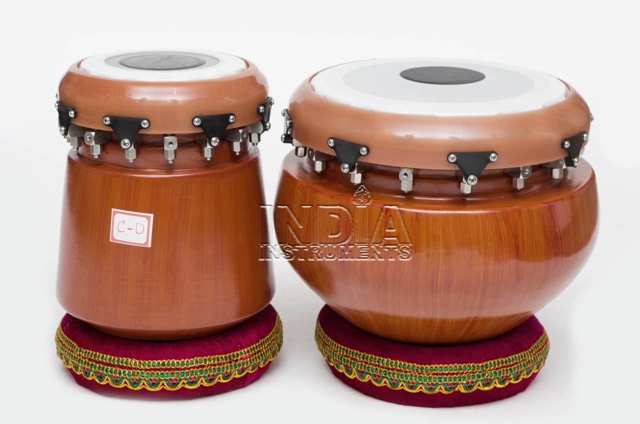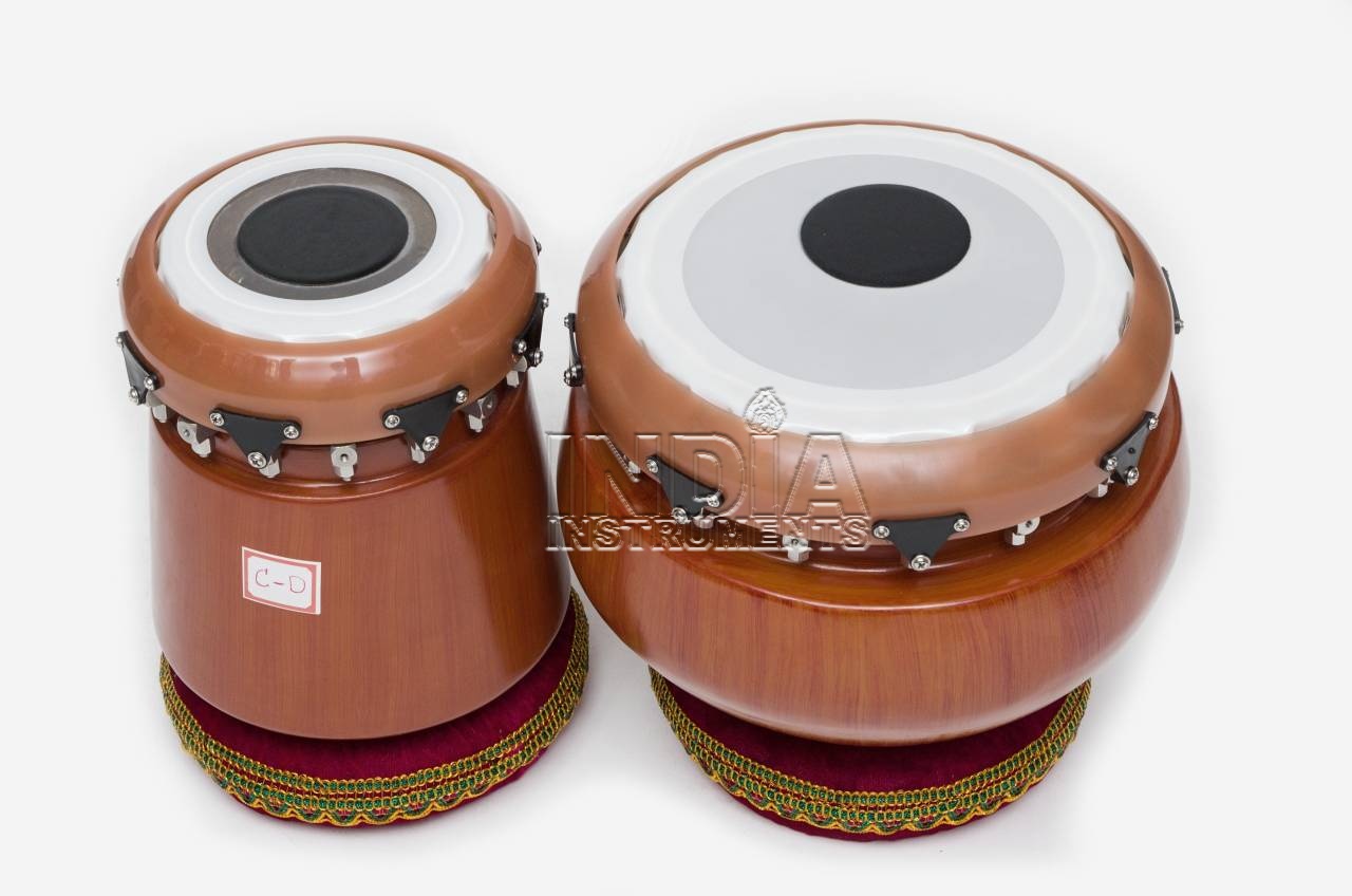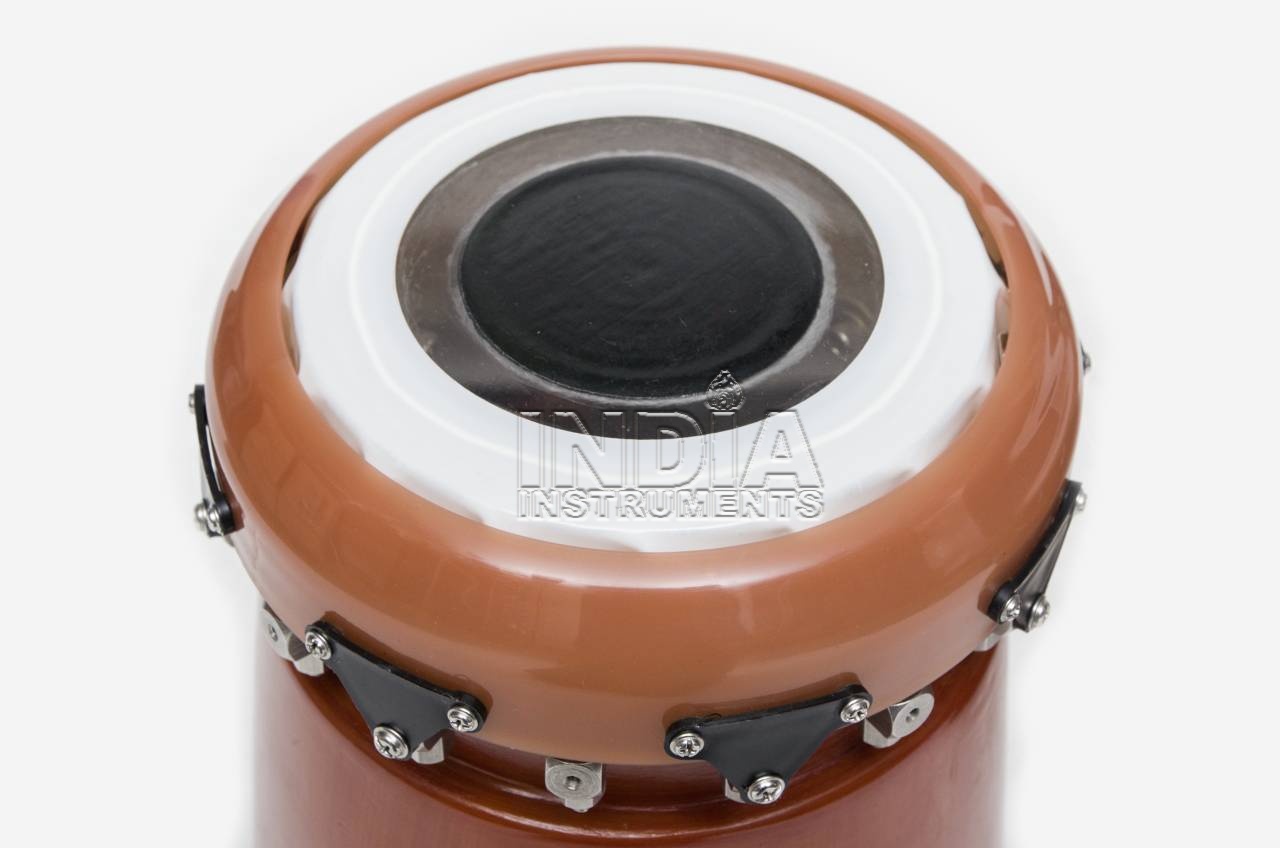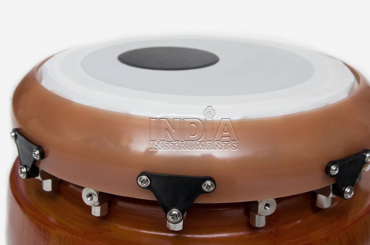 The synthetic skins are water-repellent and can be wiped with a wet cloth for cleaning. The sophisticated high quality clamping mechanism is easy to use and allows for a very accurate and durable tuning. If a skin is damaged or worn out after many years of playing, it can be replaced quickly and easily. The sound is clear and resonant, but lacks some of the finer nuances of good traditional tablas.