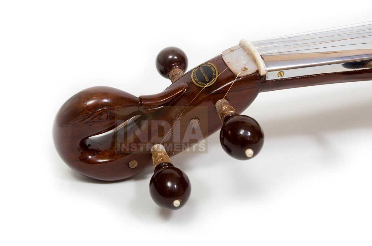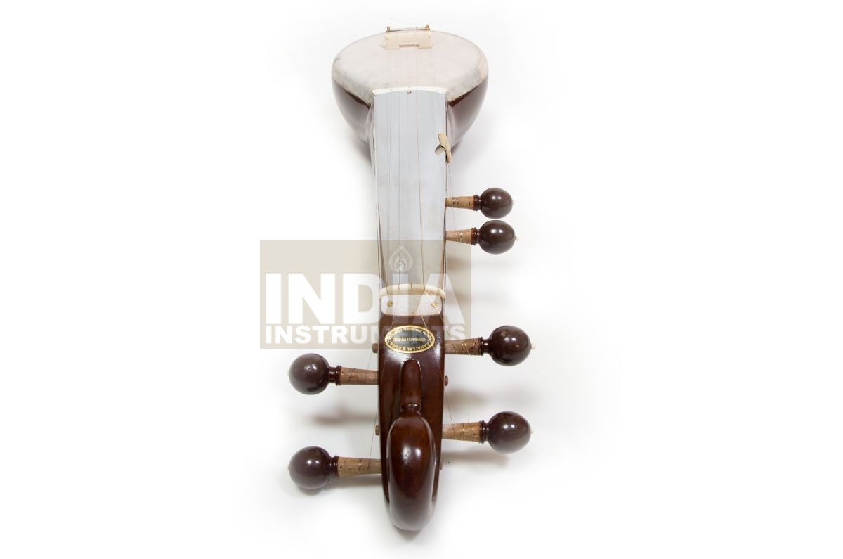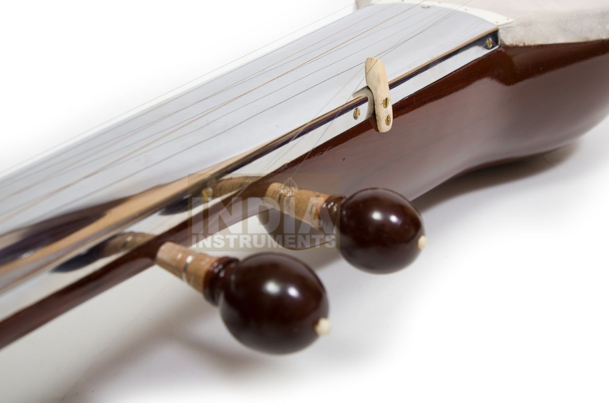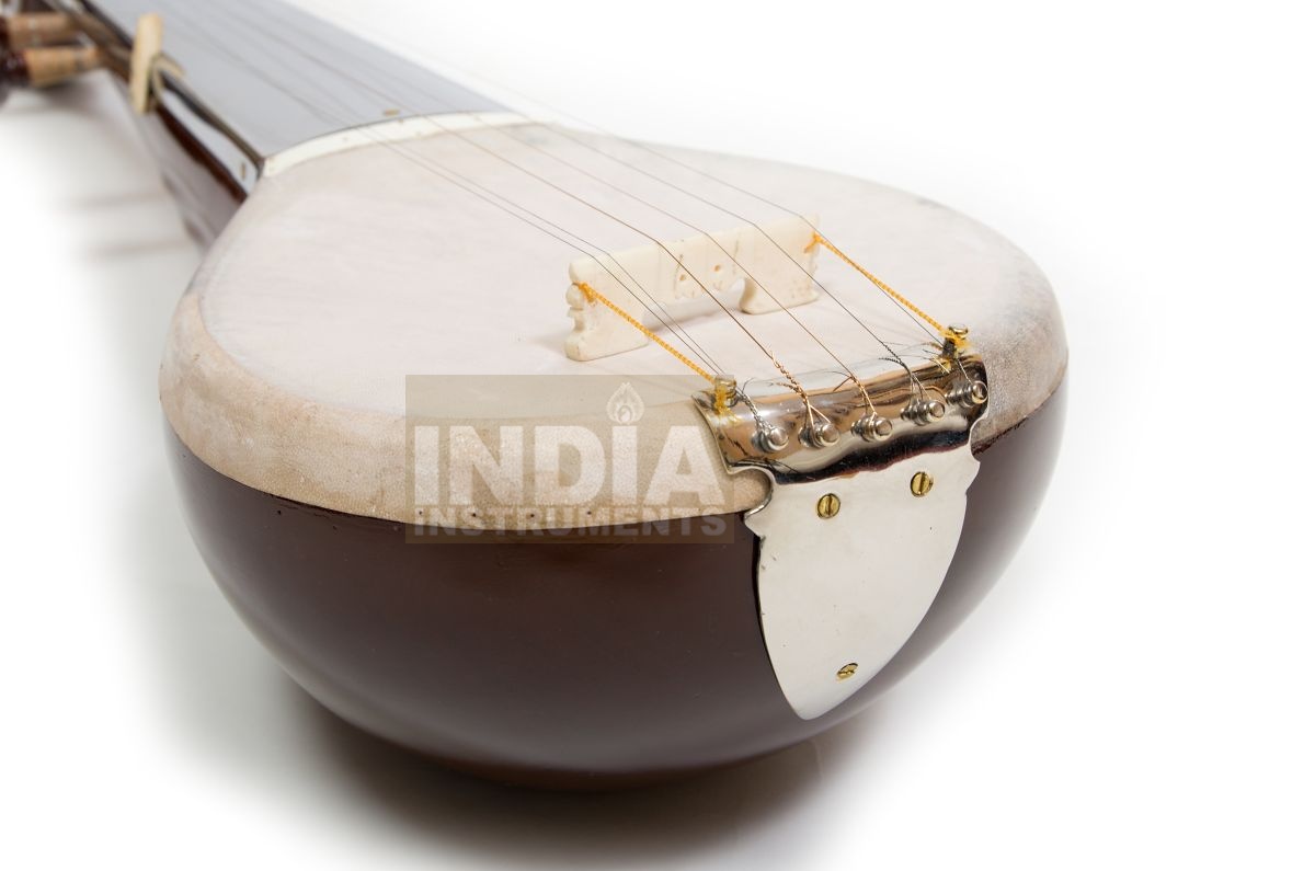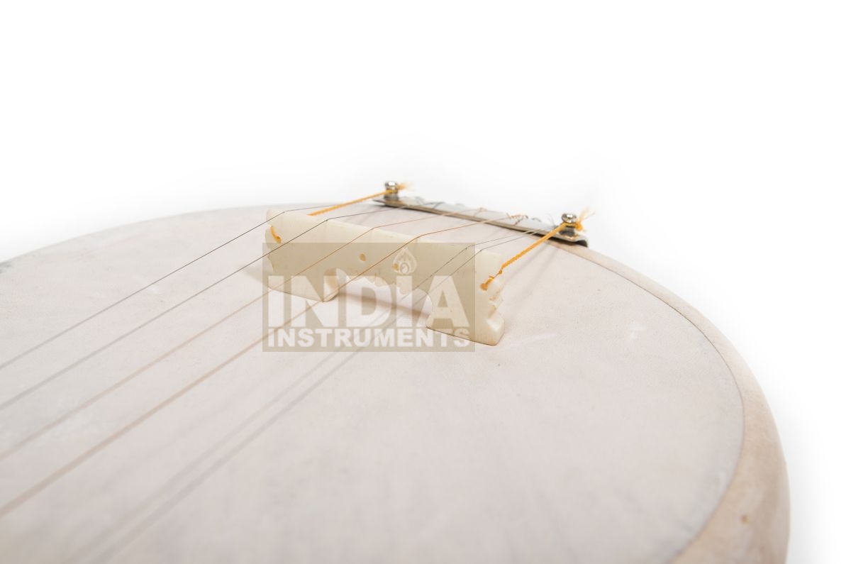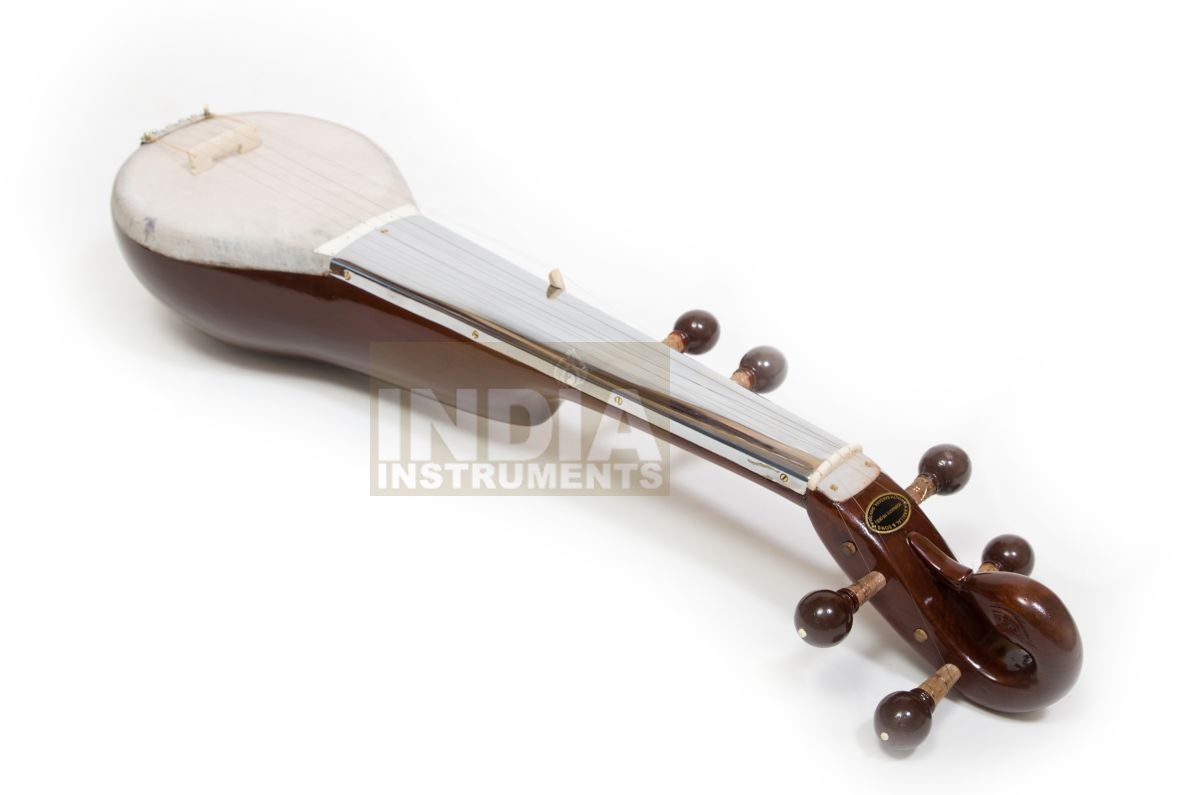 Four melody strings, 2 additional drone strings, wooden body and neck with brown polished varnish, goatskin top, metal fingerboard, simple carving decoration on body and / or pegbox, string holder made of brass. Fibreglass case included.