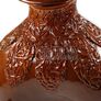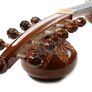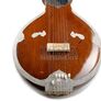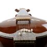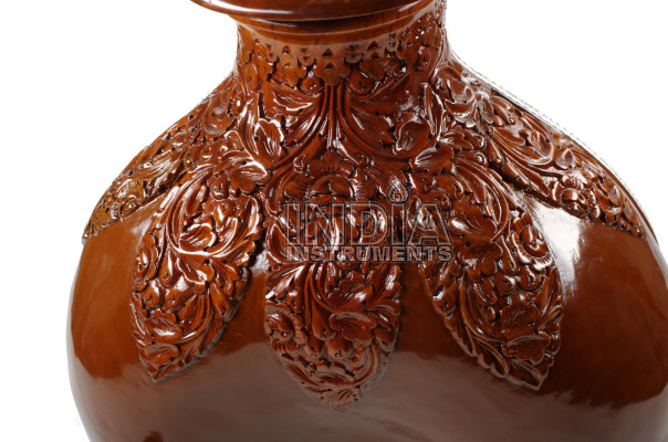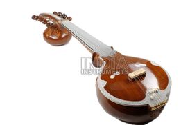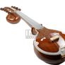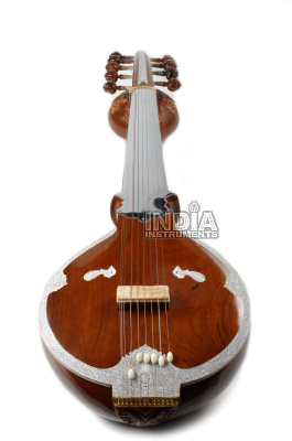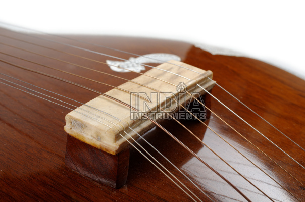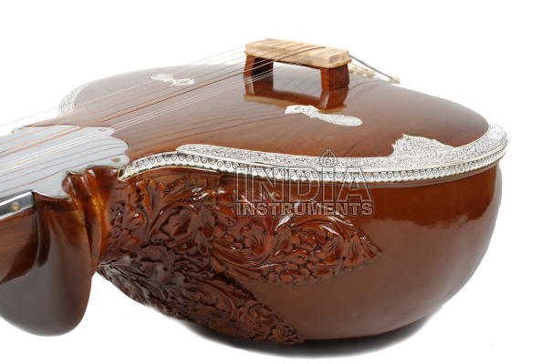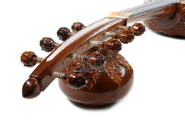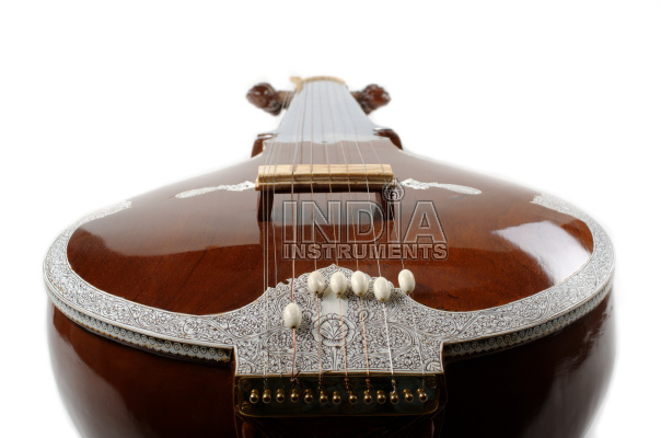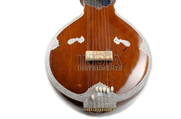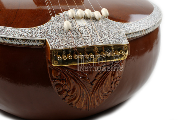 Stained toon wood, polished shellac surfaces, six melody strings, three drone / chikari strings, main gourd resonator cut in Kachua-style, closed wooden top, chromium plated steel fingerboard, rich inlay work of celluloid with stained brown engravings, base of neck fully carved in angur patta style, bone mankas, upper gourd resonator.